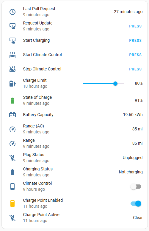 Another automation checks the reported SoC every 10 minutes when the charge point is active and the API reports the car is charging, once the SoC is greater than the target it switches off the charge point.