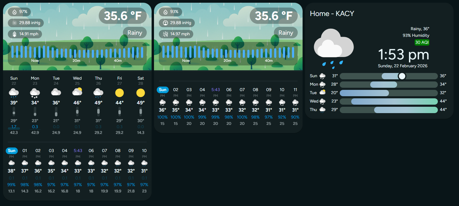 Hi All - I have been using the card on one of my Dashboards. I like it, but ran into an issue. I have not officially reported it, but think I figured out the problem… My primary weather source is NWS (Nation Weather Service). The location I look at is local to my house at ACY airport. THat NOAA/NWS location has Twice Daily and Hourly available. Due to the Twice Daily rather than Daily, the card will not display the daily forecast. See the clips below and I will post this as a feature request. First Shot is using Google Weather as the source and second is NWS. Third shot is using NWS with the Clock Weather Card.