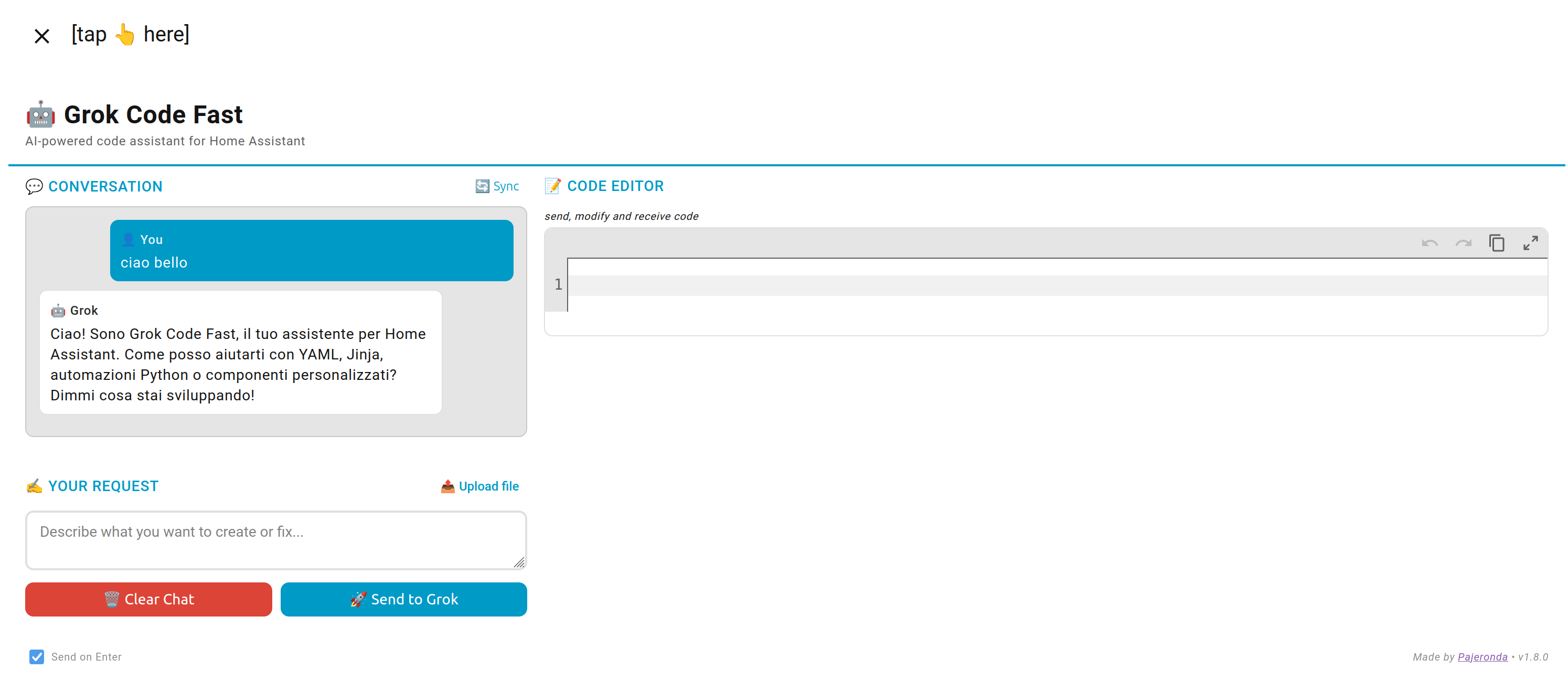 - b. an integrated code editor optimized for Home Assistant, in a card for your dashboard, for assistance, creation, and modification, based on xAI’s “Grok Code Fast 1” model.