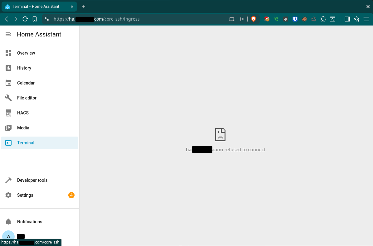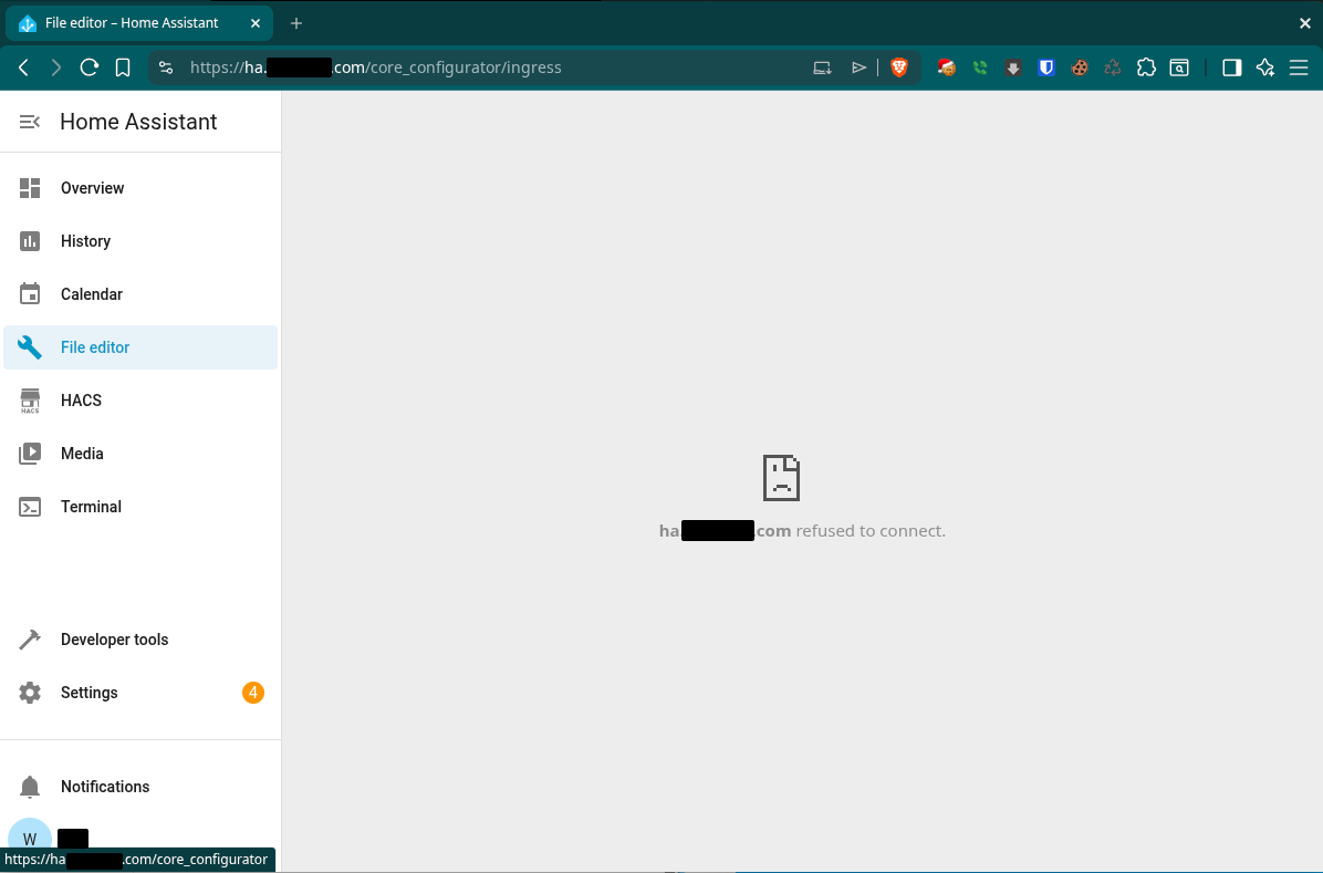 I have an nginx reverse proxy setup and most of Home Assistant works. The File Editor and Terminal & SSH addons do not. They work just fine when I access via http://10.10.1.98:8123, but not when I access through my hostname / reverse proxy. I get “ha.<my_domain>.com refused to connect”: