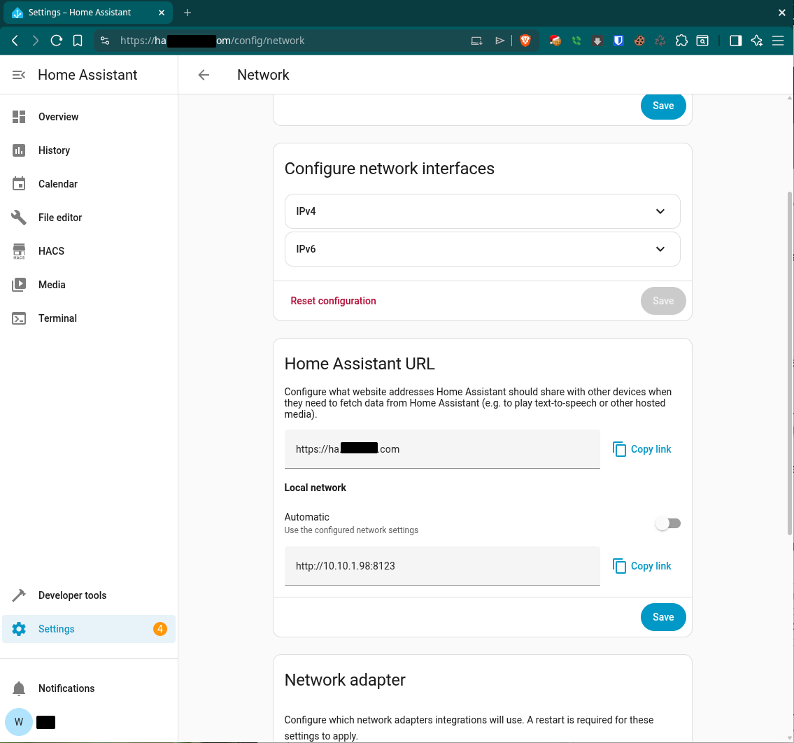 The output of the terminal hints to me that maybe Home Assistant thinks its URL is “homeassistant.local:8123” but I’m not sure how to change this. In Home Assistant > Settings > System > Network I have the URL set to my domain: