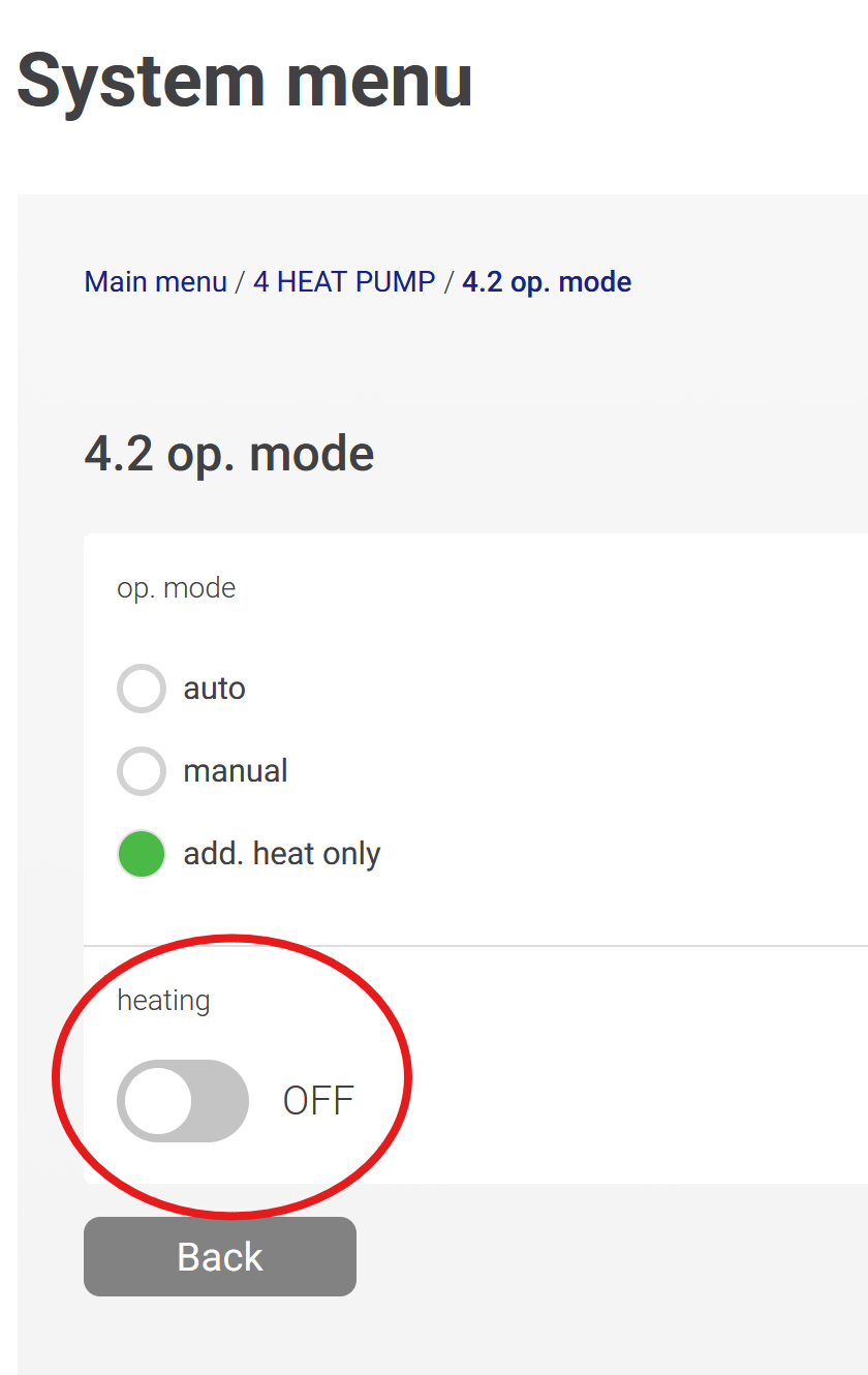 I can do this via the web myUplink by toggling the heating slider under the add. heat only setting. But I cannot find this entity in HA.