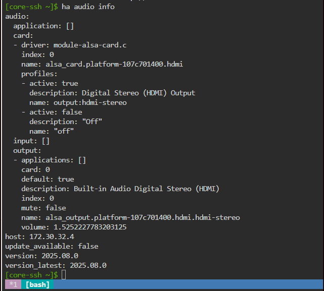 Thank you so much. I changed as you said but without any luck. This is the output of ha Audio Info.