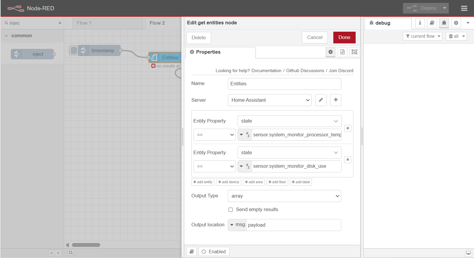 Kind of new to Node Red here. So I’m trying to poll multiple entities every 60 seconds using the “Get Entities” node on Node Red (running as an Add-On on Home Assistant) - I’m not sure what I’m doing wrong, all I see is “no results” (see attached screenshot)