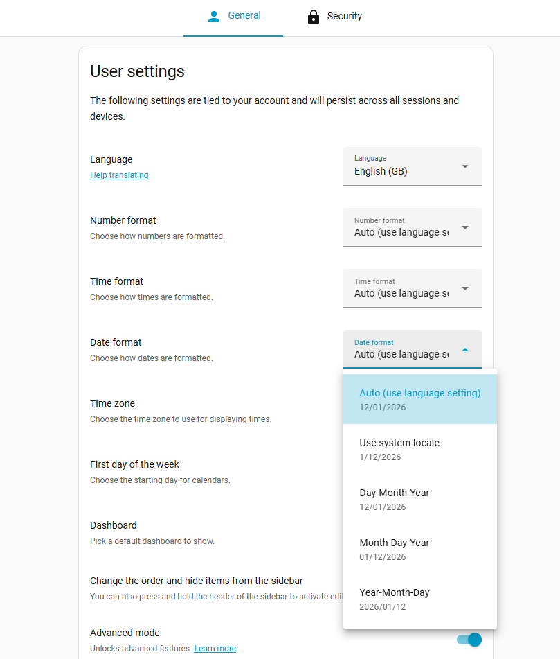 You can see that the HA user locale date is auto (which is 12/01/2026 as I am set to en-GB) or system (which is 1/12/2026 since the system default is en-US). We also have day-month-year and month-day-year, and year-month-day.
