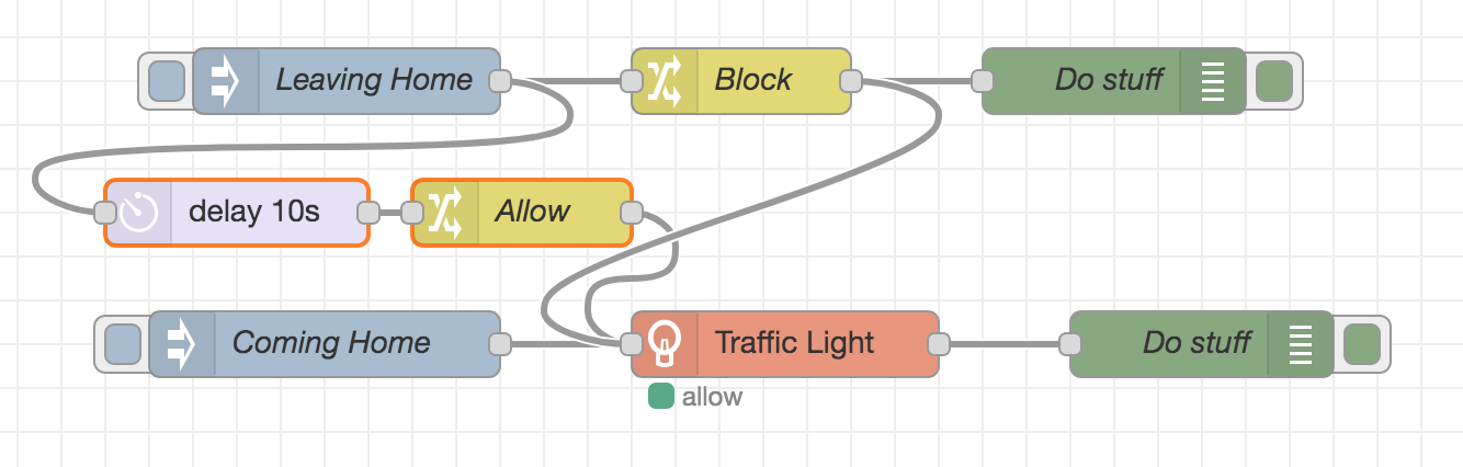 [{"id":"59909777.6b7488","type":"inject","z":"d59703d6.87ebf","name":"Coming Home","topic":"","payload":"","payloadType":"date","repeat":"","crontab":"","once":false,"onceDelay":0.1,"x":160,"y":4240,"wires":[["5e92ceaa.01ff7"]]},{"id":"5e92ceaa.01ff7","type":"traffic","z":"d59703d6.87ebf","name":"","property_allow":"payload","filter_allow":"on","ignore_case_allow":false,"negate_allow":false,"send_allow":false,"property_stop":"payload","filter_stop":"off","ignore_case_stop":false,"negate_stop":false,"send_stop":false,"default_start":true,"differ":false,"x":370,"y":4240,"wires":[["209996dd.77f58a"]]},{"id":"209996dd.77f58a","type":"debug","z":"d59703d6.87ebf","name":"Do stuff","active":true,"tosidebar":true,"console":false,"tostatus":false,"complete":"payload","targetType":"msg","x":560,"y":4240,"wires":[]},{"id":"27b8ab7.9d42554","type":"inject","z":"d59703d6.87ebf","name":"Leaving Home","topic":"","payload":"","payloadType":"date","repeat":"","crontab":"","once":false,"onceDelay":0.1,"x":170,"y":4120,"wires":[["e57a2f76.d915b","78c7d033.61a3"]]},{"id":"6117a4c4.4c09ac","type":"debug","z":"d59703d6.87ebf","name":"Do stuff","active":true,"tosidebar":true,"console":false,"tostatus":false,"complete":"payload","targetType":"msg","x":520,"y":4120,"wires":[]},{"id":"e57a2f76.d915b","type":"change","z":"d59703d6.87ebf","name":"Block","rules":[{"t":"set","p":"payload","pt":"msg","to":"off","tot":"str"}],"action":"","property":"","from":"","to":"","reg":false,"x":350,"y":4120,"wires":[["6117a4c4.4c09ac","5e92ceaa.01ff7"]]},{"id":"52d74d3b.50d034","type":"change","z":"d59703d6.87ebf","name":"Allow","rules":[{"t":"set","p":"payload","pt":"msg","to":"on","tot":"str"}],"action":"","property":"","from":"","to":"","reg":false,"x":250,"y":4180,"wires":[["5e92ceaa.01ff7"]]},{"id":"78c7d033.61a3","type":"delay","z":"d59703d6.87ebf","name":"","pauseType":"delay","timeout":"10","timeoutUnits":"seconds","rate":"1","nbRateUnits":"1","rateUnits":"second","randomFirst":"1","randomLast":"5","randomUnits":"seconds","drop":false,"x":120,"y":4180,"wires":[["52d74d3b.50d034"]]}]