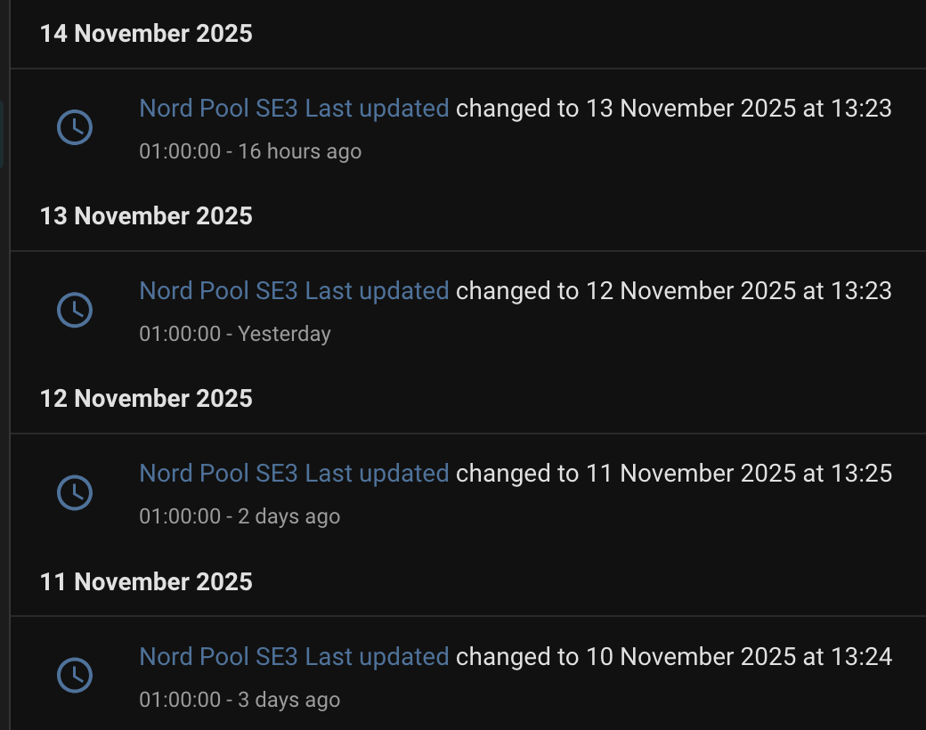 The nordpool integration “Last update” diagnostic sensor seems to be updating at 01:00 at night, in a strange way. Last night, at 01:00 on November 14, it suddenly changed from 12 november 13:23 to 13 november 13:23.