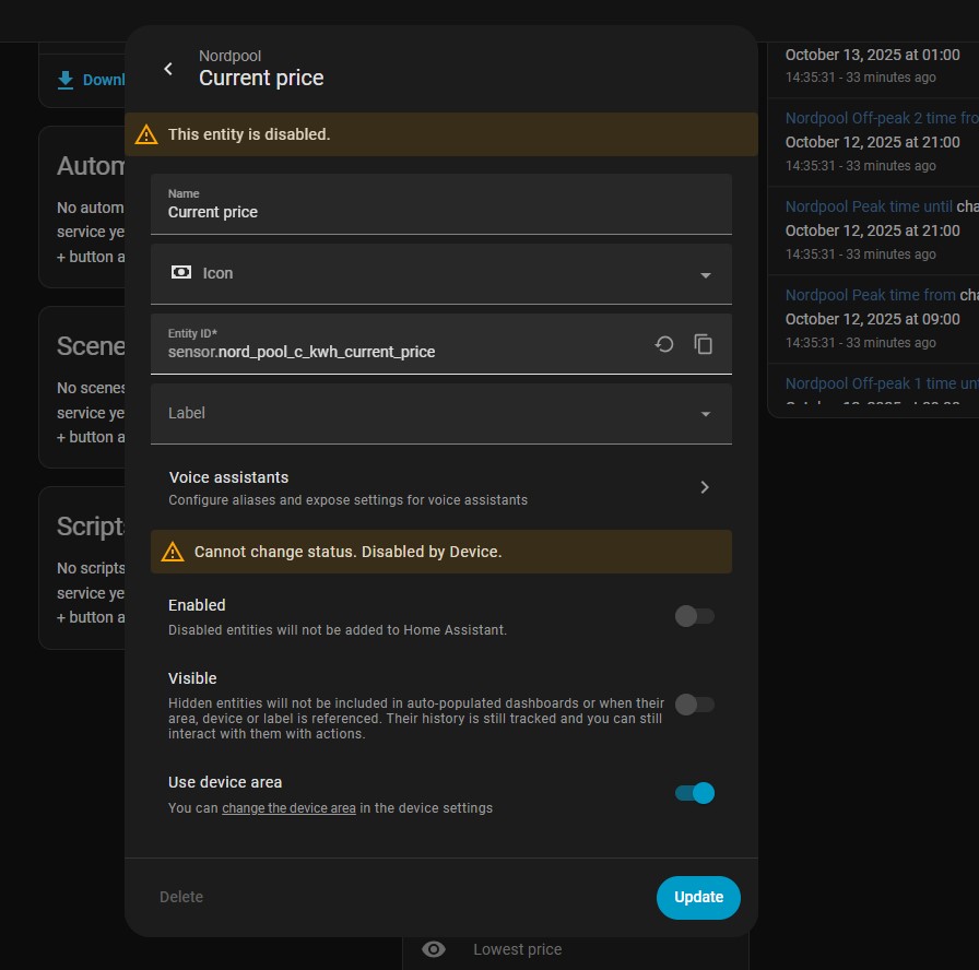 I have been trying to migrate from the Nordpool custom component to the official HA integration but I´m stuck with 6 of 24 sensors disabled by default with message “Cannot change status. Disabled by Device” and there is no way to enable it. Feels like I tried everything. Any ideas?