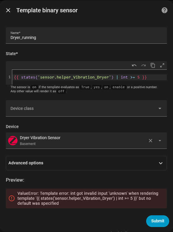 A heads up to anyone coming after, ifyou want to save a step when creating this or cleaning up your automations, you can create your helper Boolean as a template instead and use the same {{ states('sensor.helper_Vibration_Dryer') | int >= 5 }} to bypass needing the automation! You can then have it report as “Running” or “Vibration” as you wish and tie it to your washer/dryer. So handy!