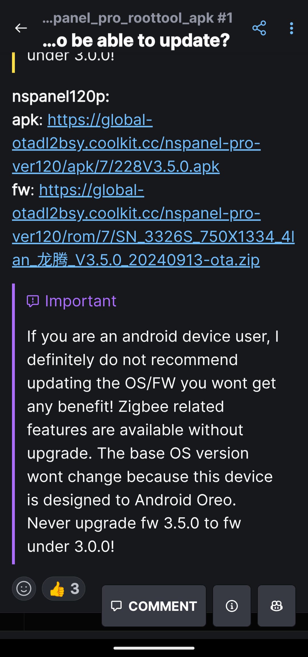I just received my Sonoff NS Panel Pro 120 and want to sideload apps to the device (FullyKiosk). The device is currently on firmware 3.7 and I receive an update notification for firmware 3.9. Should I update to 3.9 before entering dev-mode / ADB to sideload the apps or should I better stay on 3.7?