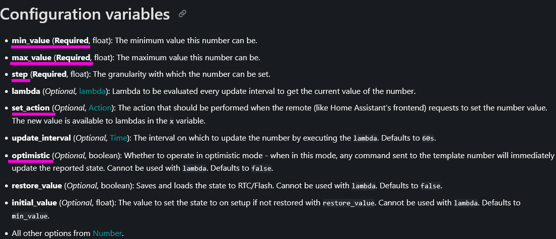 First it says must have min_value, max_value, step , none of which are on the documentation page - but clear enough to configure - although not documented that they are required