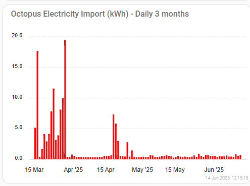 Since I have a Solar PV system, which is currently doing its job very well, my import has been just the system balancing jitter at around 0.5 kWh per day, otherwise this is what I believe you are after. Note that, for the 7th June, the figure changed at 13:19 in the afternoon. This is quite normal, since the value in this sensor is the accumulated (total) consumption (not cost) value for the day, and it comes from the smart meter to Octopus during the night, arriving in my account sometime between 09:00 and 20:00 on the day after. On a good day, I get yesterdays readings by 09:00, but on a bad day not until early evening. Gas is another matter, and not getting a reading at all for two or three days in a row can happen.