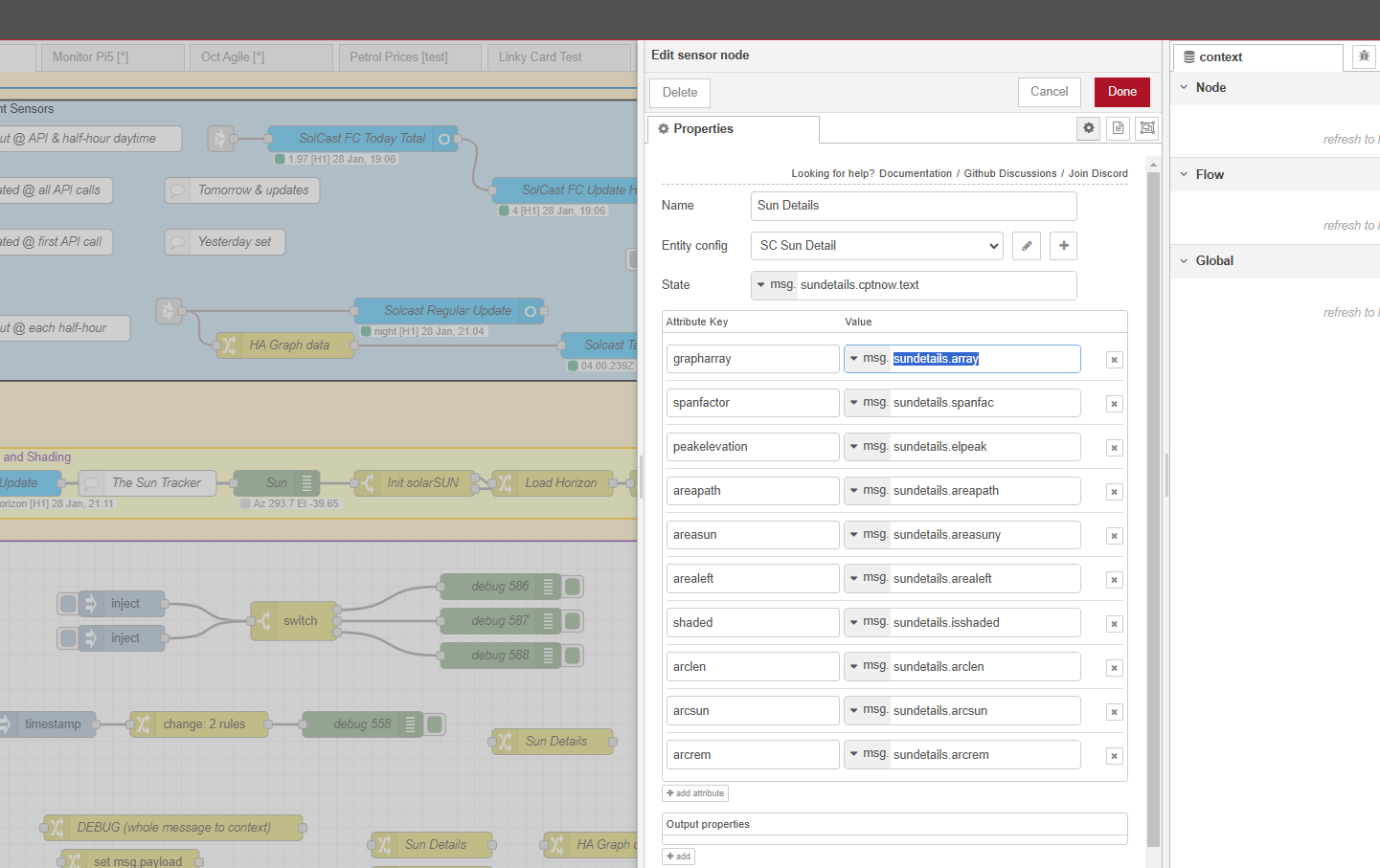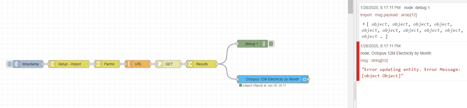 [{"id":"c5569d9c9b38ada0","type":"group","z":"2dd6b0b4a5f86125","name":"Consumption day-graph (for testing only)","style":{"label":true},"nodes":["c523a00720fbfd24","2b1273152bdb234e","f2a7abb264333158","c8ca6fb16faa1ead","03bdc0c644b5d3b2","92607112b89f4b45","343ae2b4d83cb0f5","1bec2fbf0ac54bc1","05a1494f02f9f815","36094bab72c774ae"],"x":34,"y":5819,"w":1072,"h":202},{"id":"c523a00720fbfd24","type":"sqlite","z":"2dd6b0b4a5f86125","g":"c5569d9c9b38ada0","mydb":"56ce7a19f8e148e7","sqlquery":"prepared","sql":"SELECT statistic_id, id FROM \"statistics_meta\"","name":"Long Term stats (name & id)","x":420,"y":5860,"wires":[["2b1273152bdb234e"]]},{"id":"2b1273152bdb234e","type":"change","z":"2dd6b0b4a5f86125","g":"c5569d9c9b38ada0","name":"Filter electricity previous cost sensors","rules":[{"t":"set","p":"test_a","pt":"msg","to":"sensor","tot":"str"},{"t":"set","p":"test_b","pt":"msg","to":"electricity","tot":"str"},{"t":"set","p":"test_c","pt":"msg","to":"previous_accumulative_consumption","tot":"str"},{"t":"set","p":"payload","pt":"msg","to":"payload[$contains(statistic_id, $$.test_a) and $contains(statistic_id, $$.test_b) and $contains(statistic_id, $$.test_c)]","tot":"jsonata"}],"action":"","property":"","from":"","to":"","reg":false,"x":730,"y":5860,"wires":[["f2a7abb264333158"]]},{"id":"f2a7abb264333158","type":"debug","z":"2dd6b0b4a5f86125","g":"c5569d9c9b38ada0","name":"debug 6","active":true,"tosidebar":true,"console":false,"tostatus":false,"complete":"payload","targetType":"msg","statusVal":"","statusType":"auto","x":990,"y":5860,"wires":[]},{"id":"c8ca6fb16faa1ead","type":"inject","z":"2dd6b0b4a5f86125","g":"c5569d9c9b38ada0","name":"Get long-term stats","props":[{"p":"params","v":"{\"$id1\":117,\"$days\":400}","vt":"json"},{"p":"billday","v":"24","vt":"num"}],"repeat":"","crontab":"","once":false,"onceDelay":0.1,"topic":"","x":170,"y":5940,"wires":[["03bdc0c644b5d3b2"]]},{"id":"03bdc0c644b5d3b2","type":"sqlite","z":"2dd6b0b4a5f86125","g":"c5569d9c9b38ada0","mydb":"56ce7a19f8e148e7","sqlquery":"prepared","sql":"SELECT id, state, udate FROM\n (SELECT metadata_id AS id, state, date(created_ts, \"unixepoch\") AS udate, time(created_ts, \"unixepoch\") AS utime\n FROM \"statistics\"\n WHERE metadata_id IN ($id1) AND unixepoch()-created_ts < 86400 * $days AND utime > \"20\" AND utime < \"23\"\n ORDER BY udate, id, utime DESC)\nGROUP BY id, udate","name":"Long term stats array","x":400,"y":5940,"wires":[["92607112b89f4b45","1bec2fbf0ac54bc1"]]},{"id":"92607112b89f4b45","type":"change","z":"2dd6b0b4a5f86125","g":"c5569d9c9b38ada0","name":"Analyse","rules":[{"t":"set","p":"payload","pt":"msg","to":"(\t/* June 25 - mods to include a day table, backed to yesterday, for day-consumption reporting */\t\t/* count entities recorded - expect one import or two as import and export */ \t $ids:=$distinct(payload.id);\t $imp:=$ids[0]; /* import id */\t $exp:=$ids[1]; /* export id */\t $bill:=billday;\t\t/* add month and year for easy parsing, also midday timestamp for yesterday */\t $base:=payload~>|$|(\t $x:=$split(udate,\"-\");\t {\"month\": $number($x[1]),\t \"day\": $number($x[2]),\t \"year\": $number($x[0]),\t \"timestamp\": (udate & \"T12:00:00\"~>$toMillis())-86400000 })|;\t\t/* get data end date, should be yesterday, and trim base array to one year */\t $last:=($base[id=$ids[0]].udate)[-1];\t $from:=$number($substringBefore($last,\"-\"))-1 & $substring($last,4,6);\t $year:=$base[udate>$from];\t $days:=$count($year)/$count($ids);\t \t/* compose analysis for all entities */\t $results:=$ids.(\t $id:=$;\t $array:=$year[id=$id];\t $year_total:=$sum($array.state)~>$round(2);\t $day_count:=$count($array);\t $start:=$array[day=1][0].udate;\t $month_array:=$array[udate>=$start];\t $table:=[1..12].(\t $m:=$;\t $month:=$month_array[month=$m];\t {\"month\": $m, \"year\": $month[0].year,\t \"timestamp\": $month[0].udate & \"T12:00:00\"~>$toMillis(),\t \"total\": $month.state~>$sum()~>$round(2)};\t );\t {\"id\": $id,\t \"from\": $from,\t \"base\": $month_array[0].udate,\t \"last\": $last,\t \"days\": $day_count,\t \"total\": $year_total,\t \"dtable\": $base,\t \"months\": $table^(timestamp)}\t );\t\t/* block by billing day, summing prior bill day inclusive to next bill day exclusive */\t/* array of billing dates over data period */\t $bdates:=$base[id=$imp and day=$bill].udate;\t $bills:=$bdates[[1..20]]#$mon.(\t $dnext:=$;\t $dfrom:=$bdates[$mon]; /* mon is already from 0 when starting map at 1 */\t $dupto:=$fromMillis($toMillis($dnext & \"T12:00:00.000\")-86400000)~>$substringBefore(\"T\");\t $period:=$base[udate>=$dfrom and udate<$dnext];\t $debit:=$period[id=$imp].state~>$sum()~>$round(2);\t $credit:=$period[id=$exp].state~>$sum()~>$round(2);\t {\"from\": $dfrom,\t \"upto\": $dupto,\t \"kWh\": $debit,\t \"credit\": $credit,\t \"bill\": $round($debit-$credit,2)};\t \t );\t\t {\"import\": $results[id=$imp],\t \"export\": $results[id=$exp],\t \"bills\" : $bills\t };\t\t\t\t)","tot":"jsonata"},{"t":"set","p":"payload","pt":"msg","to":"(\t $l:=$count(payload.import.dtable);\t payload.import.dtable[[$l-90..$l]];\t)","tot":"jsonata"}],"action":"","property":"","from":"","to":"","reg":false,"x":640,"y":5940,"wires":[["343ae2b4d83cb0f5","36094bab72c774ae"]]},{"id":"343ae2b4d83cb0f5","type":"debug","z":"2dd6b0b4a5f86125","g":"c5569d9c9b38ada0","name":"debug 7","active":true,"tosidebar":true,"console":false,"tostatus":false,"complete":"payload","targetType":"msg","statusVal":"","statusType":"auto","x":720,"y":5980,"wires":[]},{"id":"1bec2fbf0ac54bc1","type":"debug","z":"2dd6b0b4a5f86125","g":"c5569d9c9b38ada0","name":"debug 8","active":false,"tosidebar":true,"console":false,"tostatus":false,"complete":"true","targetType":"full","statusVal":"","statusType":"auto","x":480,"y":5980,"wires":[]},{"id":"05a1494f02f9f815","type":"inject","z":"2dd6b0b4a5f86125","g":"c5569d9c9b38ada0","name":"Find id we want","props":[{"p":"params","v":"{}","vt":"json"}],"repeat":"","crontab":"","once":false,"onceDelay":0.1,"topic":"","x":1