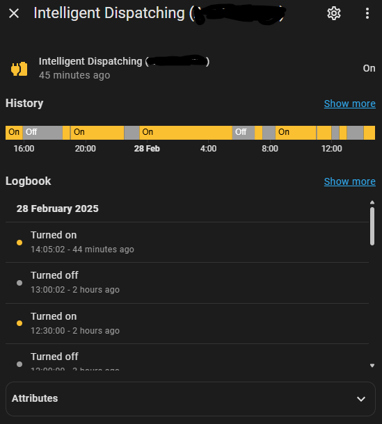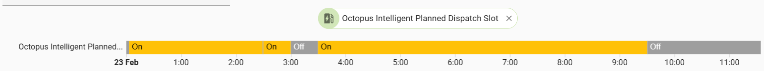 Just beware with dispatching it will not necessarily be ‘on’ during that fixed off-peak period anymore, even though you will be on your cheap rate. To capture both IO slots and the fixed off-peak period, use the ‘off peak’ sensor.