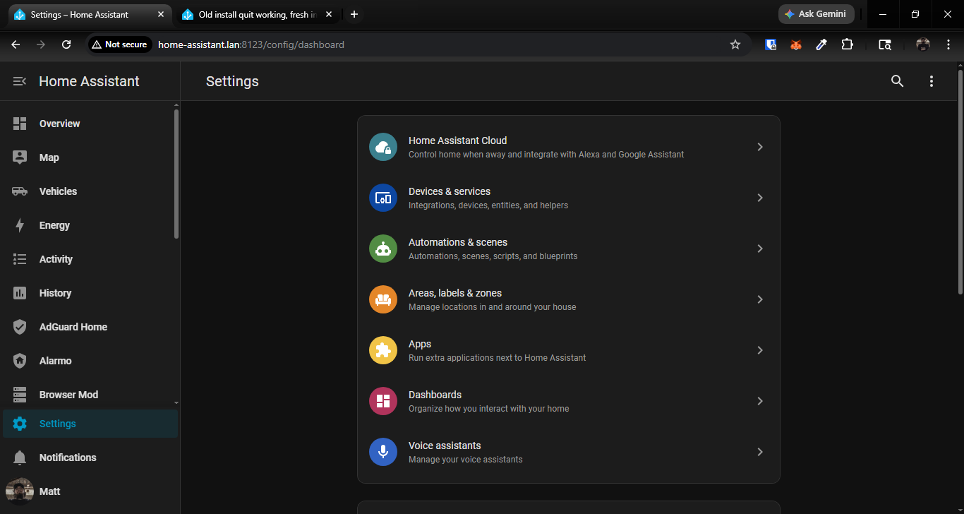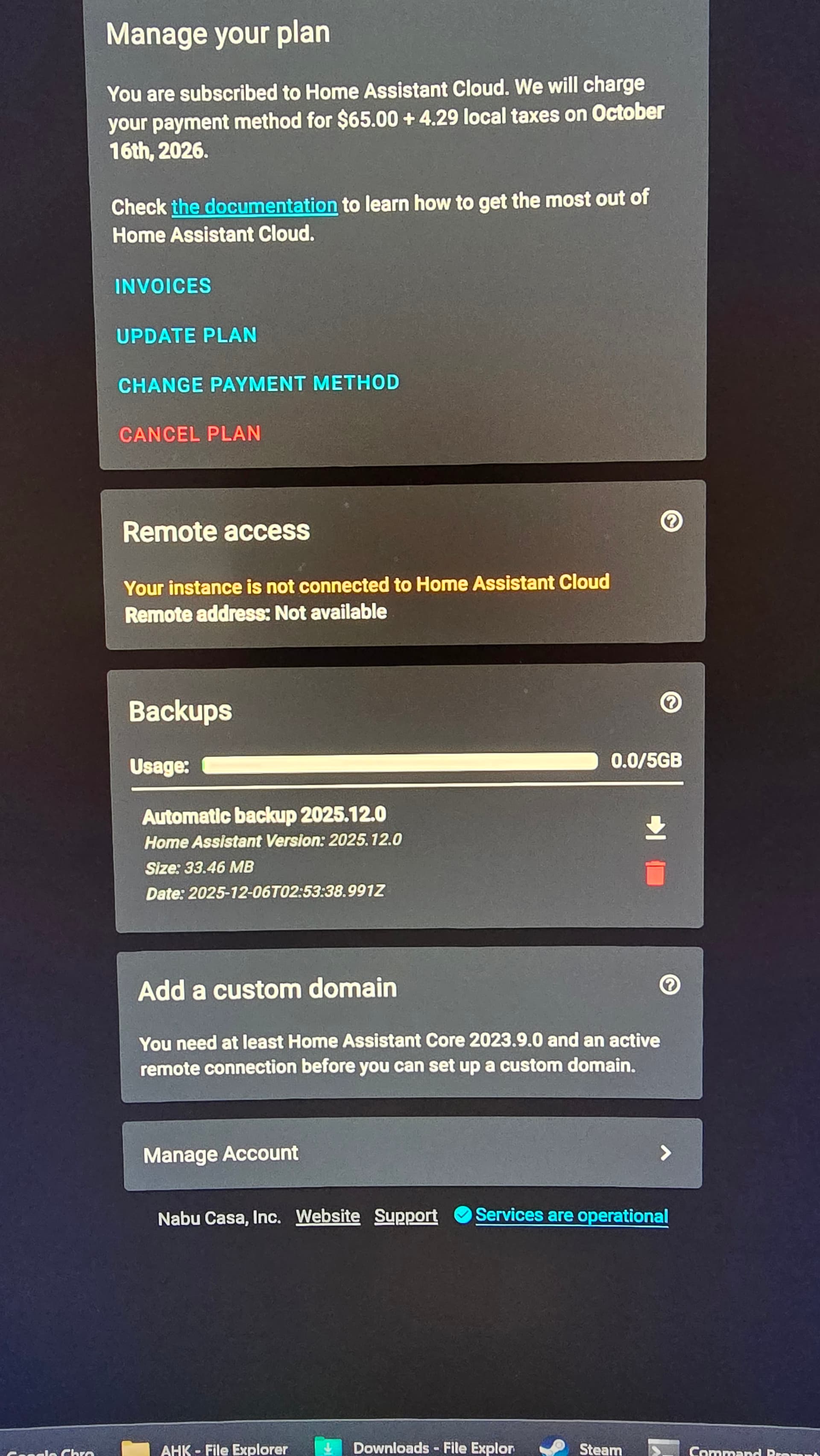 Sorry for the wall of text about to appear. I have had HA installed for several years on a Windows laptop running in VA. Several times in the past my instance would quit working. After much troubleshooting and help from the community, it always seemed the only solution was to do a fresh install. The biggest problem with that is adding 150+ zones on the map and resinstalling all the software for my smart home. Not the most efficient thing to do and requires so much time to get everything back right. I was using duckdns to access it away from the house and that mostly worked fine. There were some issues at some point and I decided to do a fresh install and pay for HA cloud to insure stability and get rid of those problems. It ran perfect with 0 glitches for about 3 months and then sure enough, I can not connect from outside of my network again on either Android phone. I did my best to troubleshoot again to no avail. I figured here we go again. I did a fresh install again, but I can still not get it to work outside of my home. I can login to a local browser and see HA and monitor everything. The more troubleshooting I do the more confused I get. When I log in to nabu casa page it gives me this error: