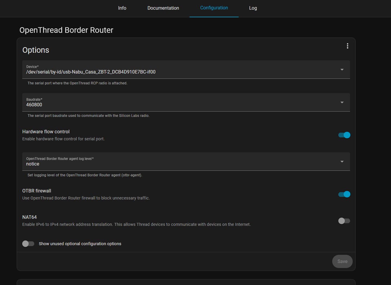 [NOTE]-AGENT---: Radio URL: spinel+hdlc+uart:///dev/serial/by-id/usb-Nabu_Casa_ZBT-2_DCB4D910E7BC-if00?uart-baudrate=460800&uart-flow-control