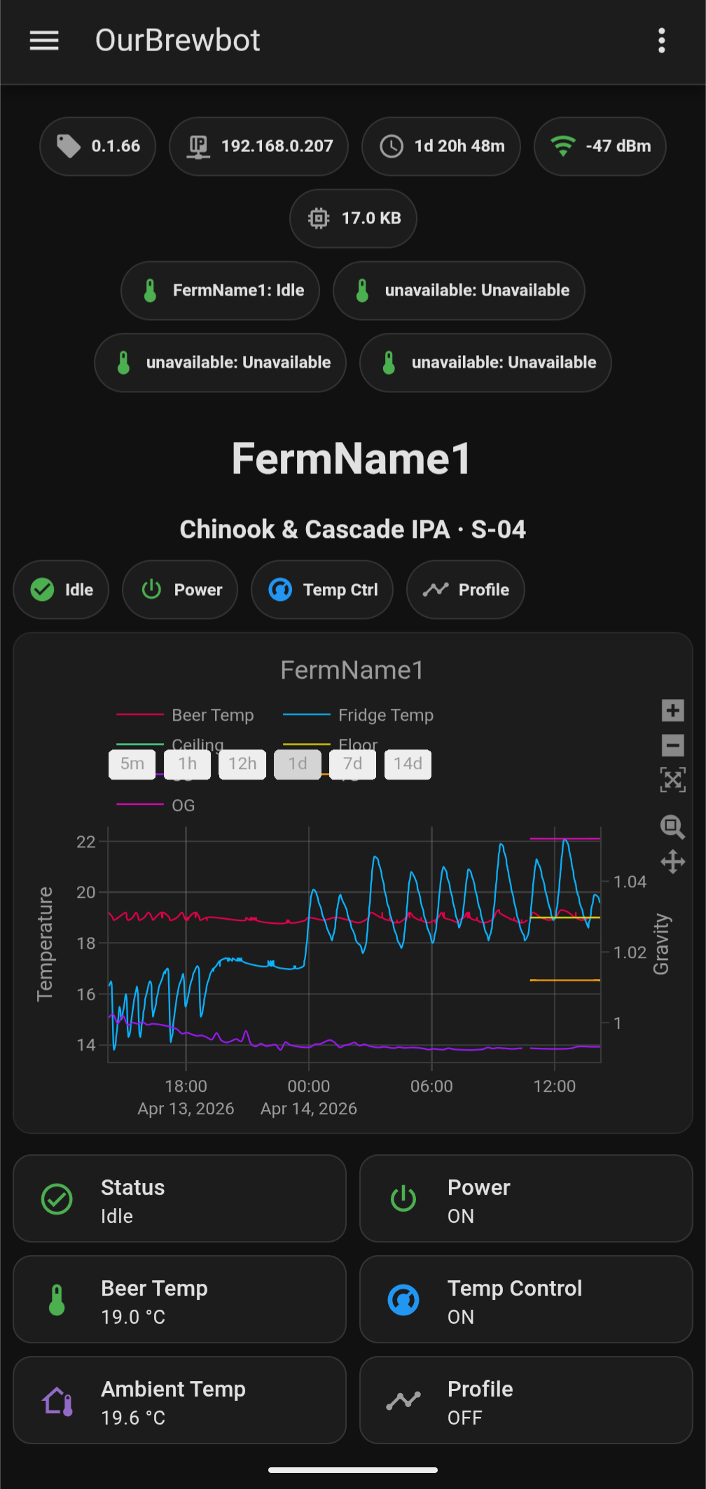 On top of this, OurBrewbot adds a number of improvements. There is a full web-based admin interface and a local REST API, so you no longer depend on any external service to control and monitor your fermenters. Brewfather and Brewer’s Friend integrations are included with per-fermenter toggles. Tilt hydrometer support, with full Tilt Pro support, has been tested with simulated hardware. The device also registers itself on your local network via mDNS, making it easy to find without hunting for the IP address. Syslog support was added, to allow for the remote collection of the same logs that are output to the serial port.
