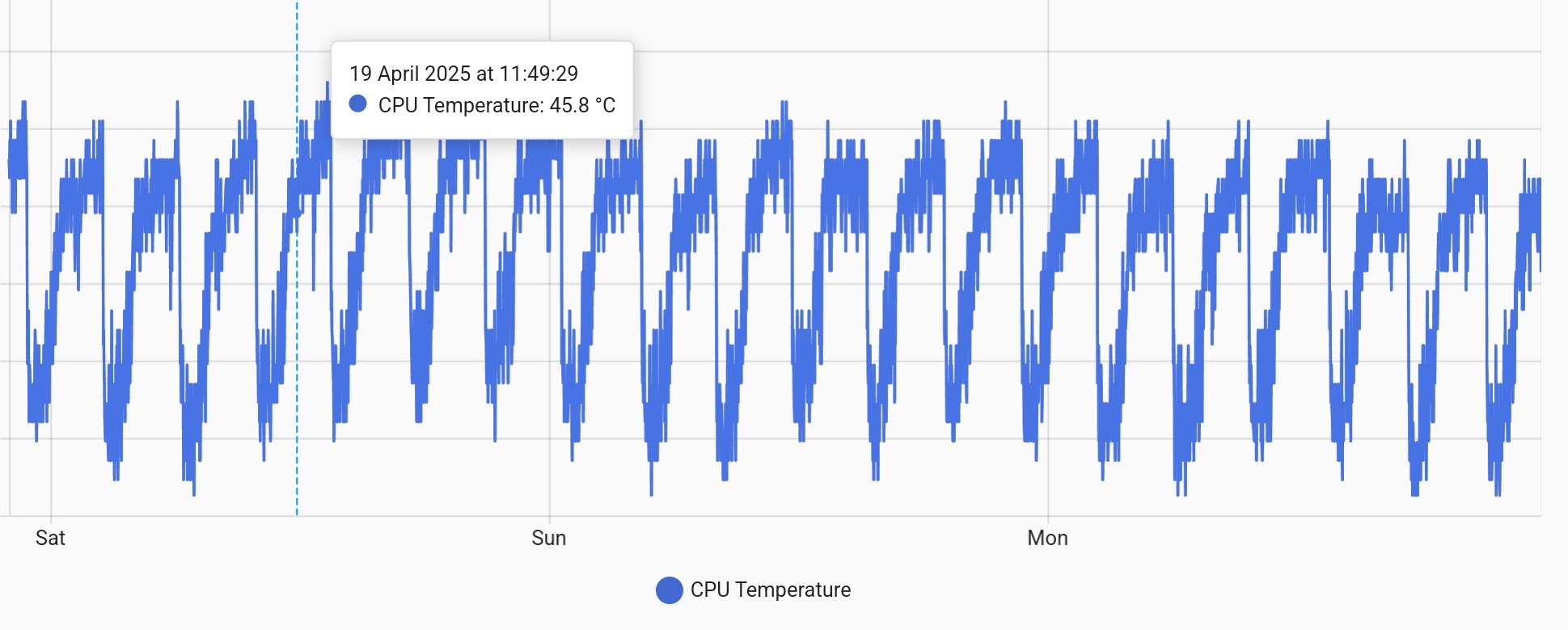 I have a suspicion I am seeing the same thing. Ever since last Thursday it’s (CPU temp) been cycling up and down every 3.5 hours