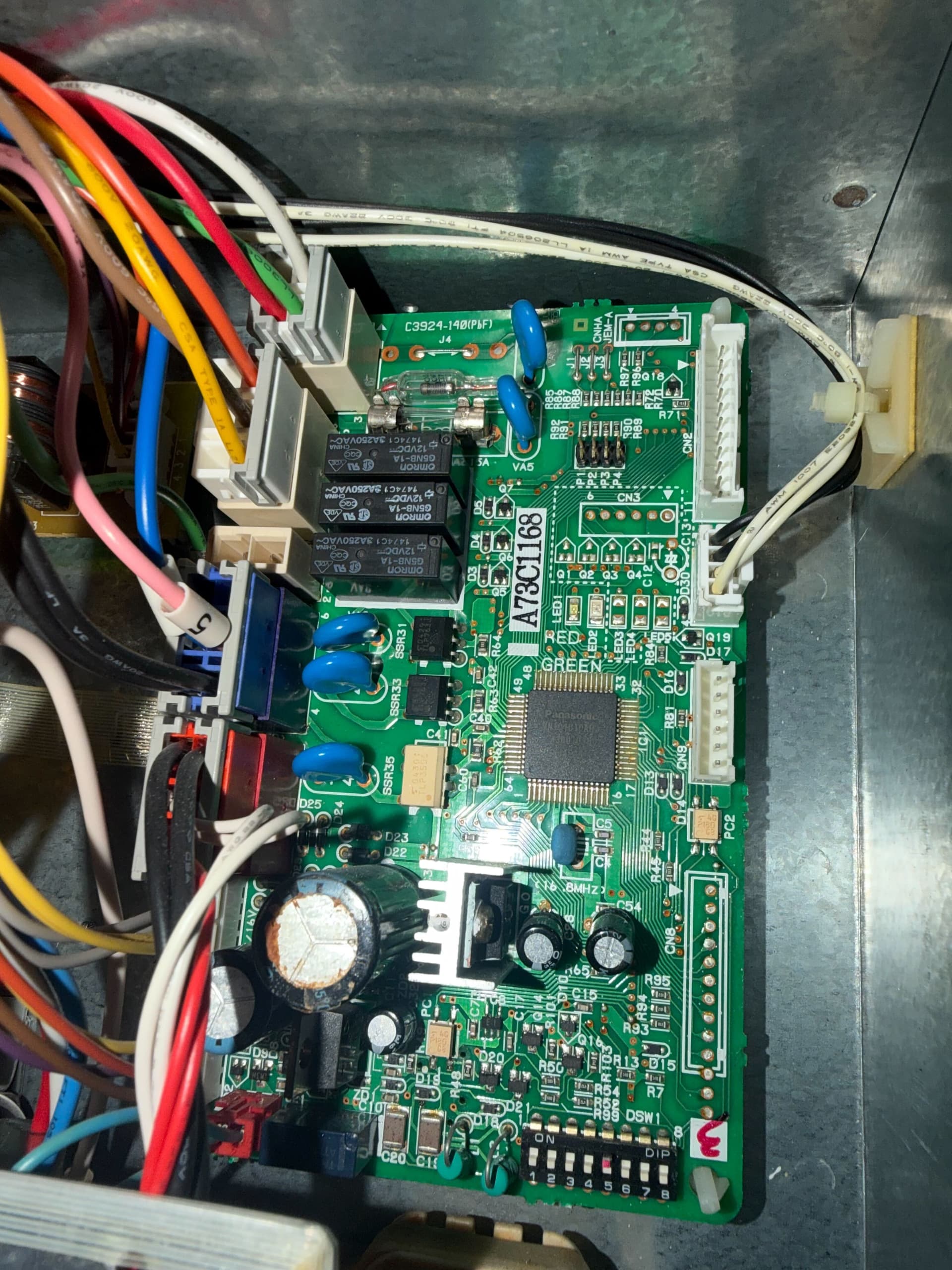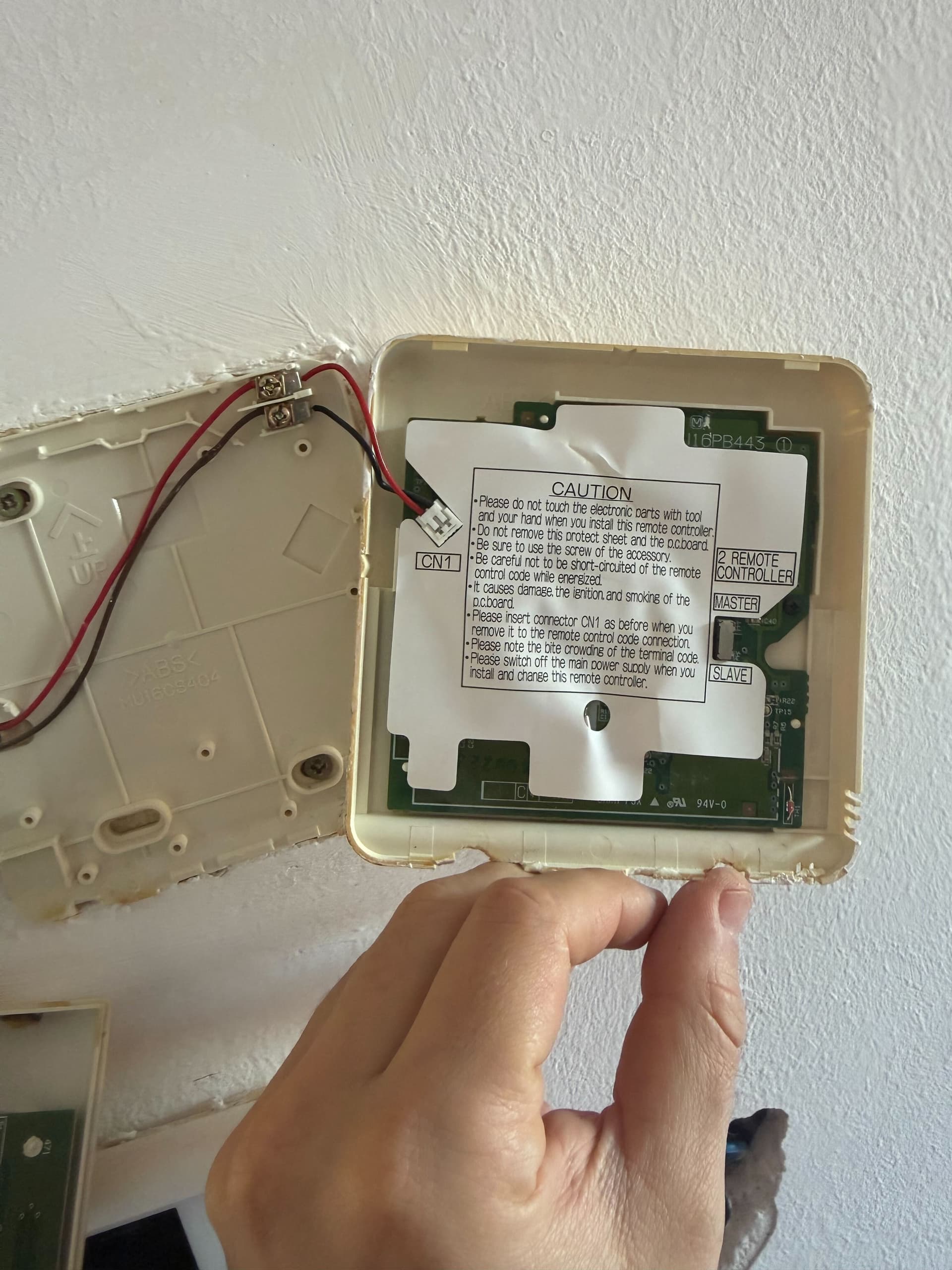I’ve opened the wired controller and the indoor unit PCB. The controller uses a Renesas H8/3823 MCU with discrete transistors near the bus connector — no MM1192 HBS chip, no coil. No IR receiver either (it’s a concealed ducted unit), and no WiFi module or CN-CNT port.