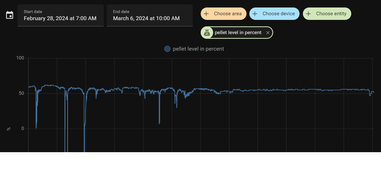 Then just create an input_datetime for the time that you last filled the stove. I do the same for the time I last cleaned it. Once you establish known values you can further abstract it into a percentage.