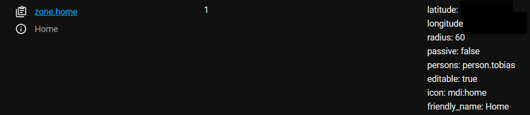 I have only one zone defined which is my home address. I call it āmyHomeā in my last post. The name in HA is āhomeā (like āhomeā, not āHomeā or āhOmEā or something else).