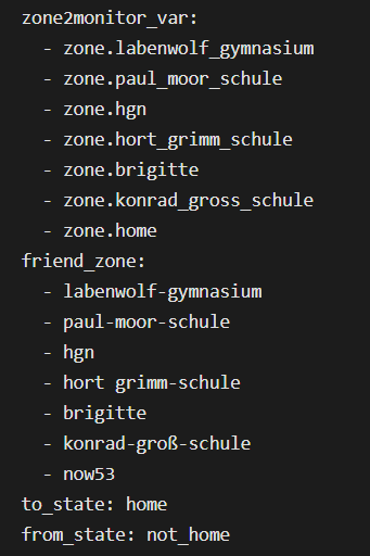 I assume this is due to the fact that the to_state is āhomeā like in the zone2monitor_var list but in the friend_zone list the friendly name ānow53ā is used.