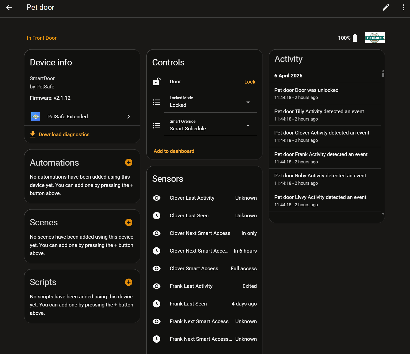 You can also submit PRs or further info to the API itself here GitHub - ThomasHFWright/petsafe-api: Connect and control a PetSafe devices using the PetSafe API. · GitHub
