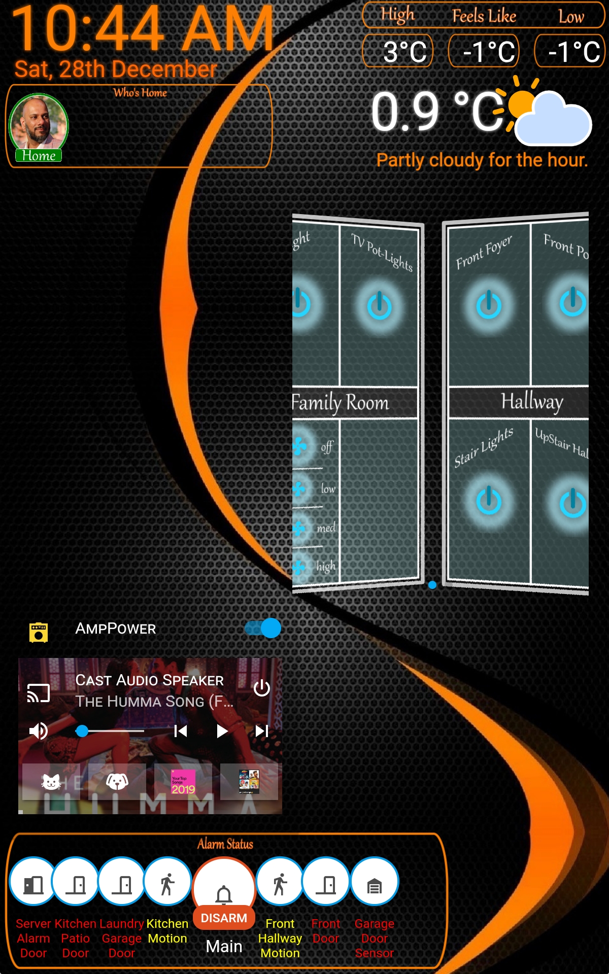 Custom picture-elements wall UI on my Huawei 10" tablet. Using swiper card for lights switches, custom layout cards, mini media card, browser mod and custom header. Browser mod using it for camera popup when garage door opens, and soon will add DIY smart doorbell camera. Still lots to do, but wanted to share my UI