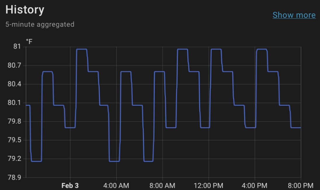 I have both heaters set to 84° F and an automation that turns both outlets on when the temperature is below 80° F and off when it is above 80.01° F. This is working well, but has some overshoot, so the actual temperature varies from about 79°F to 81° F. (BTW, event monitoring didn’t seem to work, so my automation checks every 5 minutes).