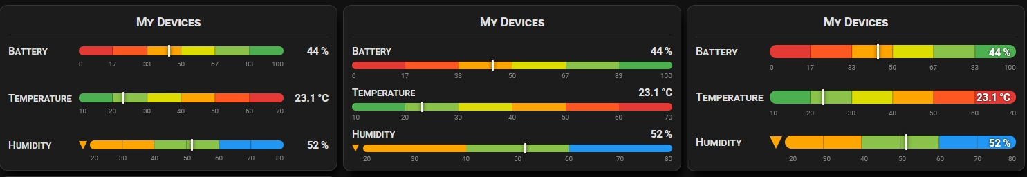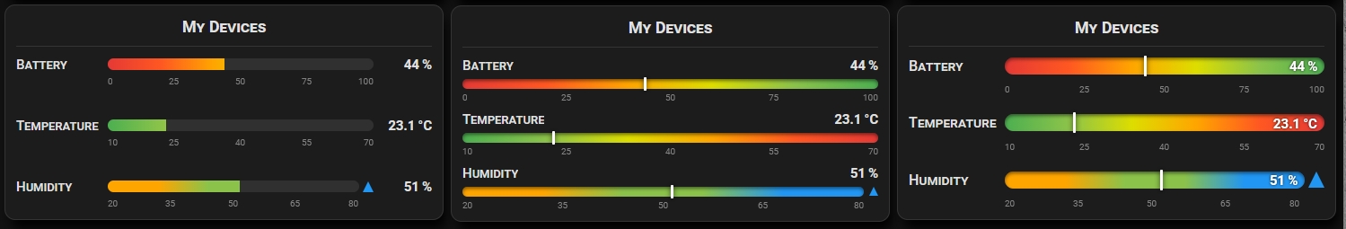 - Independent min/max range per device — mix units freely (%, °C, W, kWh)