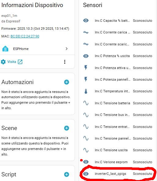 PROBLEM IS THAT ESP01 on ESPHome DOES NOT WORK in HOME ASSISTANT : it returns UNKNOWN in the entities values ( not NOT AVAILABLE…)… and the log reports “timeout to poll” after QPIGS command from ESP01