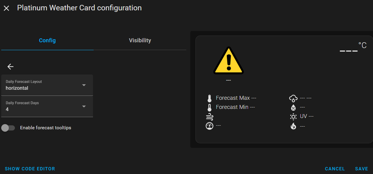I have a strange problem with the card. I’m using met.no weather provided (but tried also with Open Weather) - I cannot get forecast for next few days. If I put something on the marked fields - card become black.
