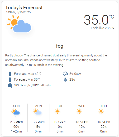 Hi, I’m curious to know, if anyone has managed to get the Daily Forecast Section showing as a Horizontal stack with the daily detailed description (that you see in the vertical stack option). This seems to get dropped if you use the cards default Horizontal stack option.