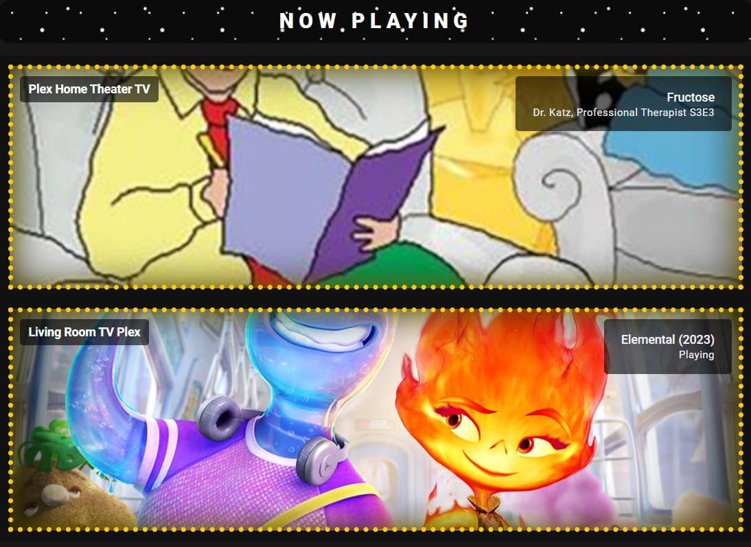 Here’s a little Panel (Single Card) display that I made for a home theater display for Plex. It has a old school marquee vibe to it and can handle multiple players at once. For best results use a dark theme for the view (makes sure that the text is white).