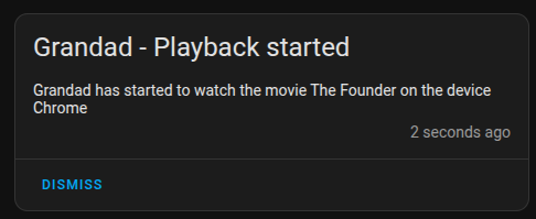The Admin Playback Started shows all users minus the main Plex account). I can see notifications appearing :