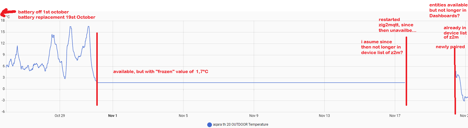 so in a dry timesplot, i does an device reapairing as usual and device came back to zigbe2 , stable aprox 150 lqi, nearly 100% battery (and all names of device and all related single entities of that device do have exact the old names, whats good, because is not not the default z2m usually creates it, so it remembers “some how” and had not created “new” device id?) showing states, mosquito shows all sensors (temp, battery etc.) i can access history from entities search in hasio and from mosquito device page.