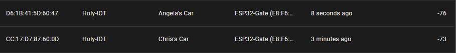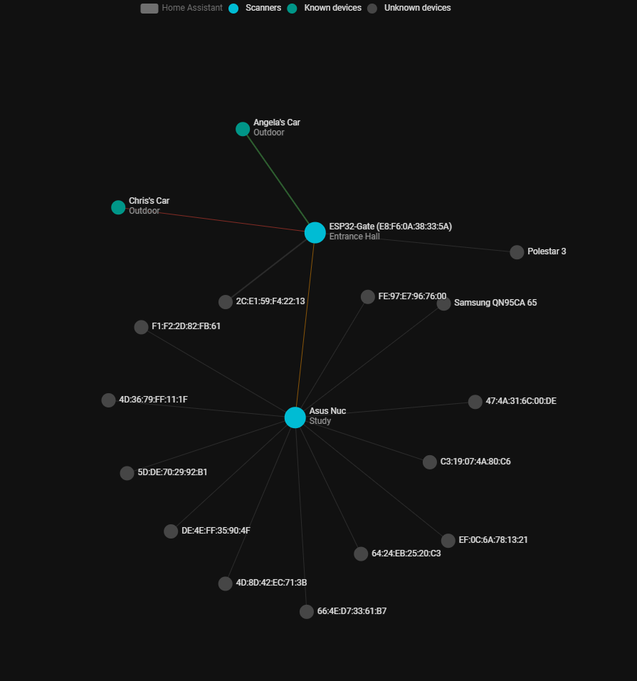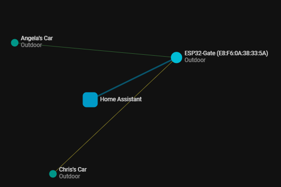 I have set up an ESP32 as a bluetooth proxy that I was going to mount adjacent to the gate. I have also set up two beacons (Angela’s Car and Chris’ Car) to install in family members cars. Home assistant can see these under Bluetooth network visualisation as below