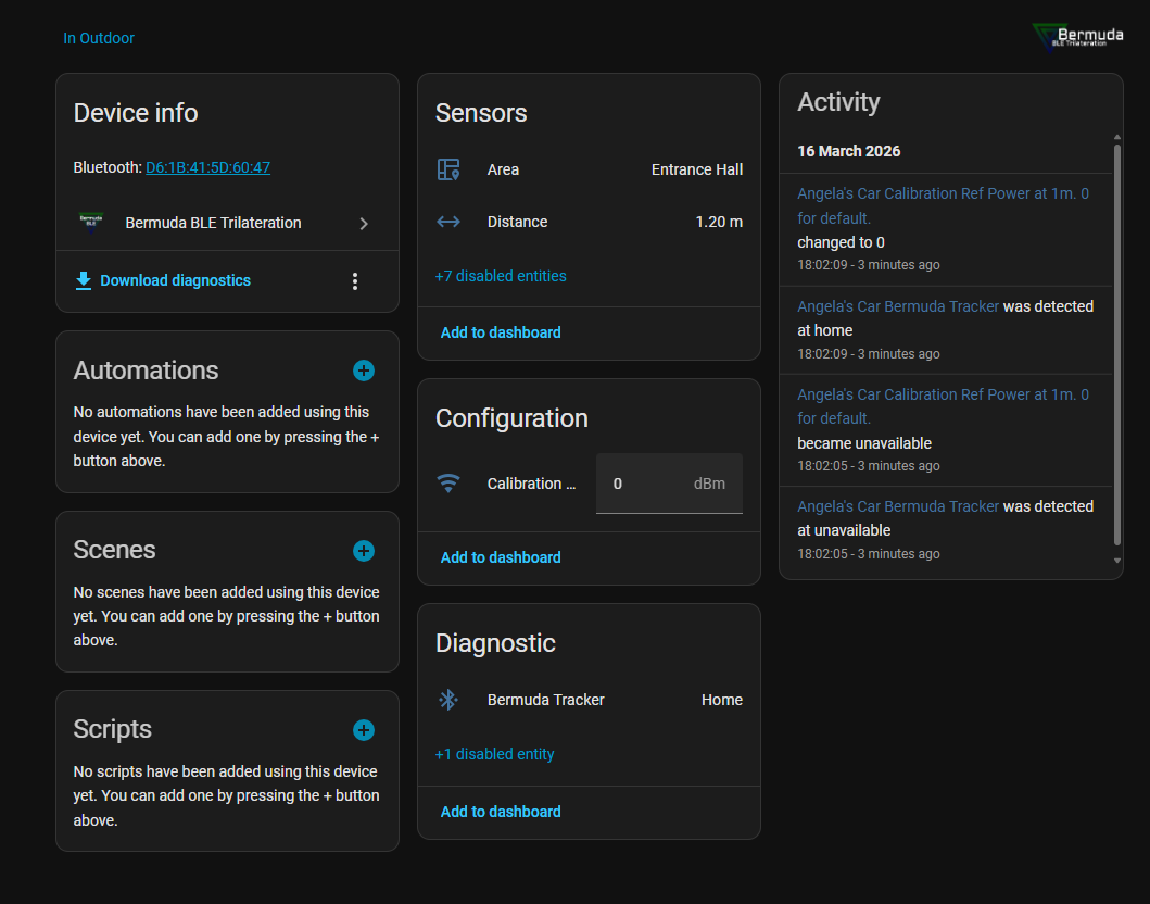 At the moment a beacon in the same location as the proxy is showing as 1.2 to 1.7m away which is roughly correct but I think I need to calibrate this? Do I need to set a distance of more than say 10m away as being “Away” and anything les “at Home” If so where do I adjust this in Bermuda or in ESP32 Home?