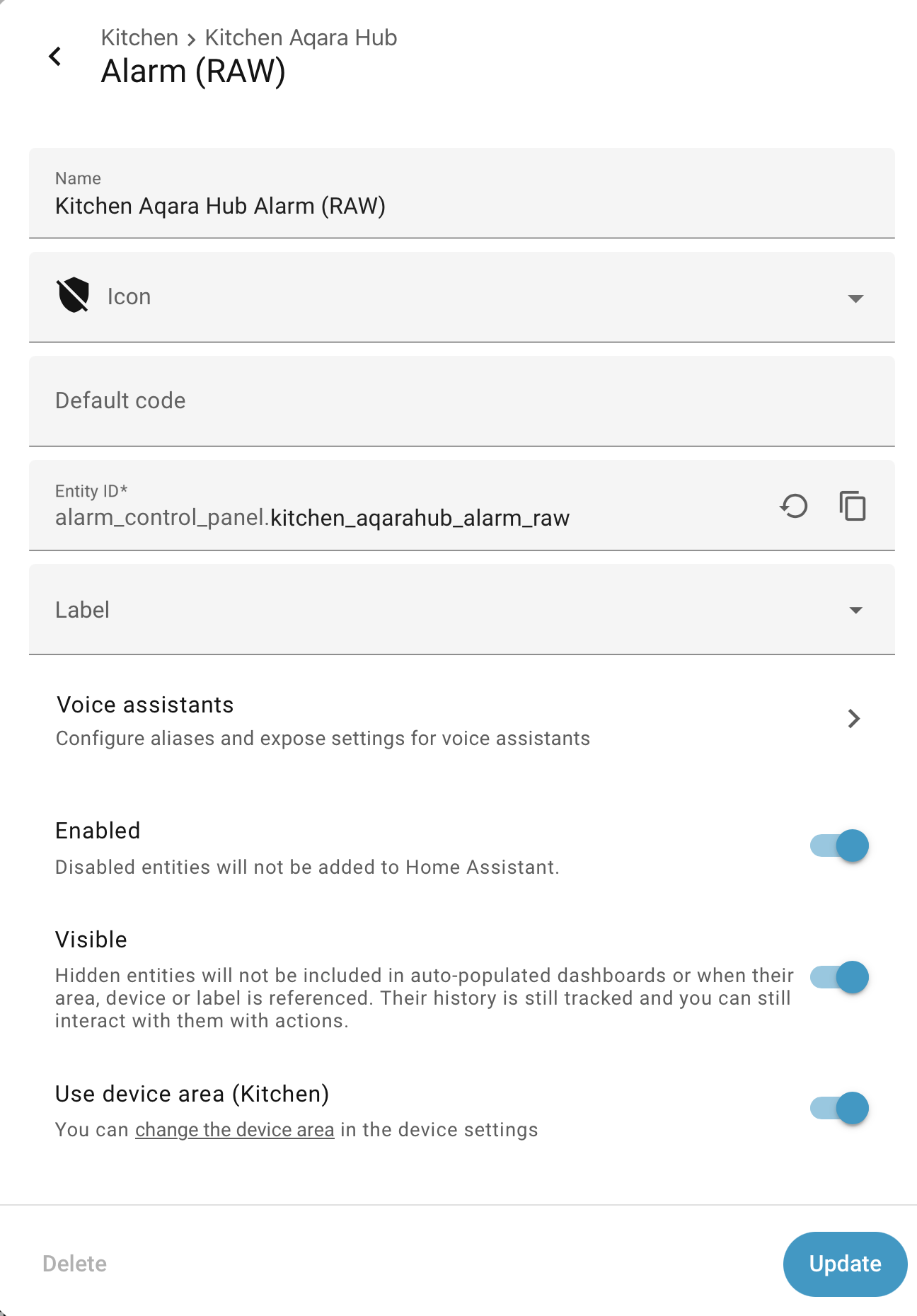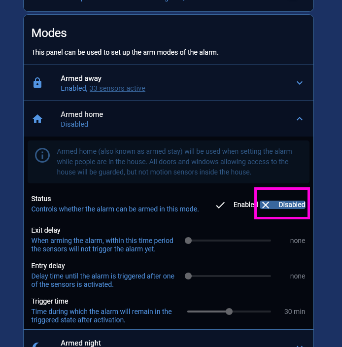 I have migrated my Xiaomi Gateway from HomeKit to HA via HomeKit controller, everything works fine except that the alarm control panel shows unsupported modes “Home” and “Night”. My gateway only supports “Away” and “Off”, is it possible to customise the alarm control panel to hide unsupported modes?