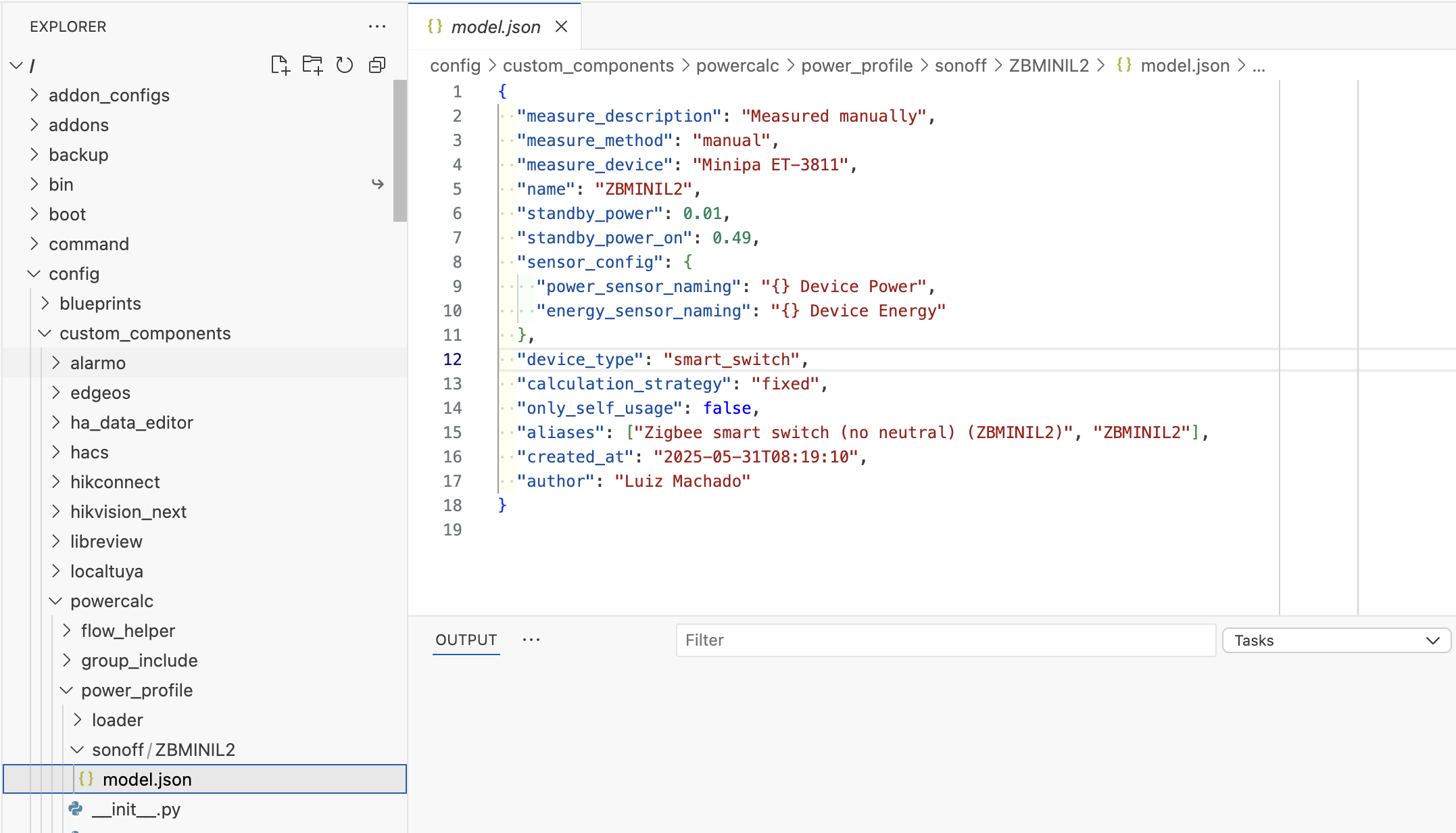 I create a model.json (/config/custom_components/powercalc/power_profile/sonoff/ZBMINIL2/model.json).
