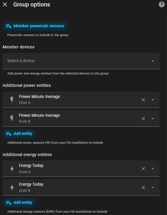 I tried setting up powercalc to group a few emporia panel clamps. My dryer has two legs, A & B. I made a powercalc group: