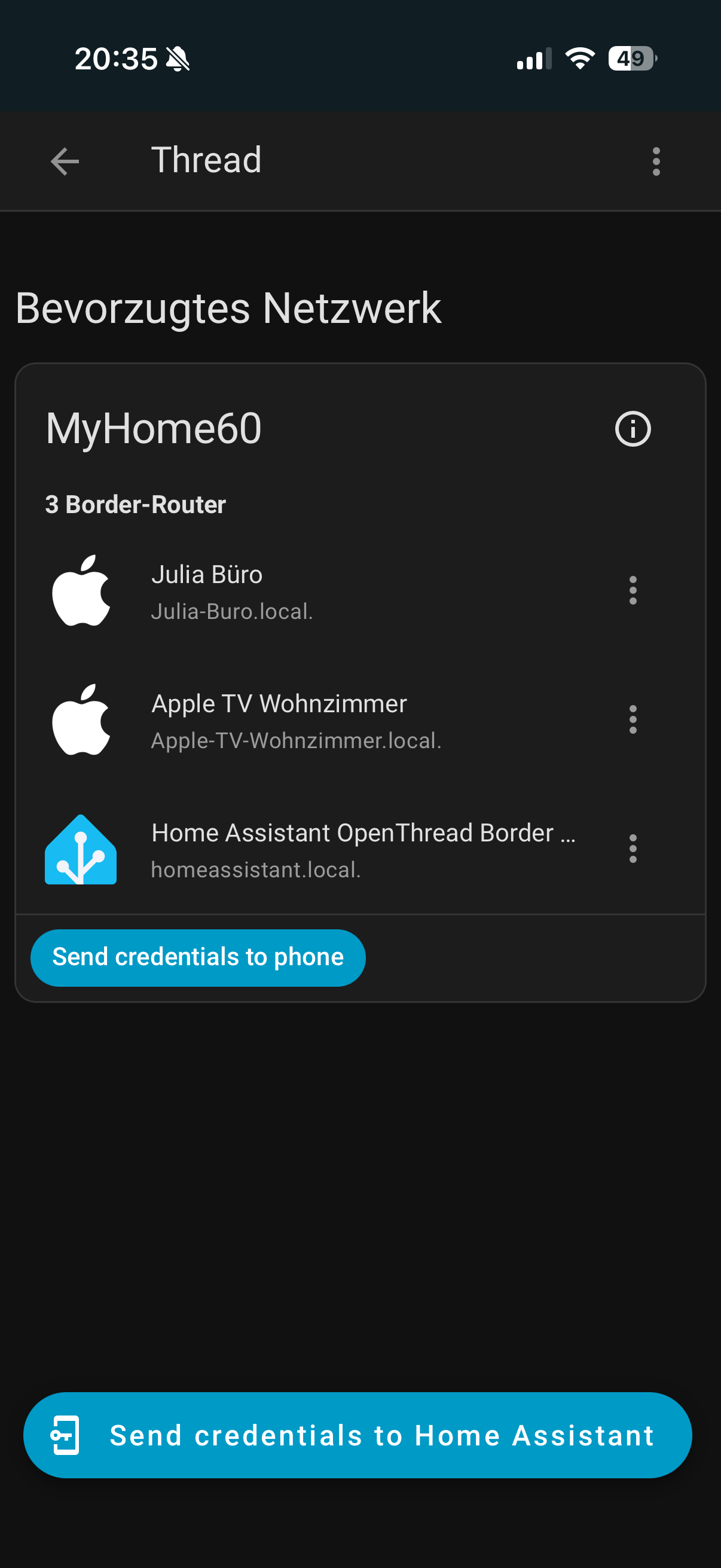 Realize that now that are all one Thread network. There are pros and cons about having multiple TBRs, but before you remove them/unplug them, click on the 3-dots for the HA OTBR and select it for the iOS/Android credentials where you should then see a âkey in a phoneâ icon. Credentials are tied to an TBR when pairing a device. This may actually be a problem because I suspect you have the Thread creds already stored on your iOS device and you gave it to HA so your Creds may already be on your phone stored against an existing Apple TBR. You should be able to delete existing Thread creds in your iOS device using the HA Companion App. and then you can âSend credentials to phoneâ.