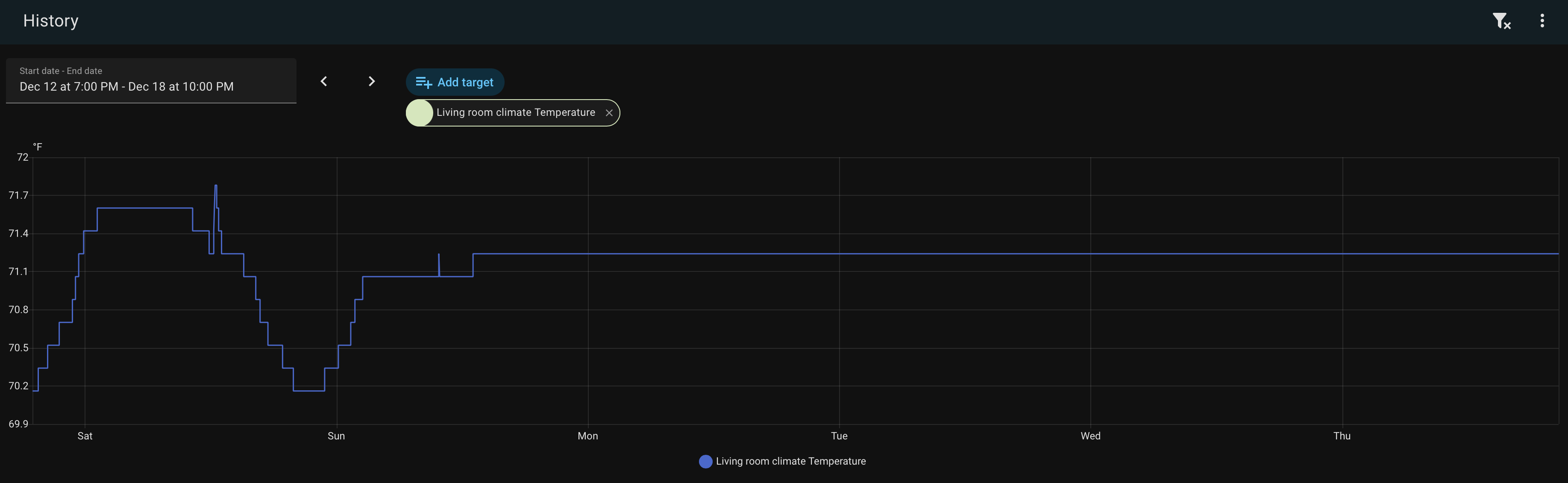 1 - The history time is shifted. This is visible in the following screenshot because the consumption peak (blue trace) visible shortly after 4 p.m. actually happened at 11:30 p.m. (the water heater that turns on during off-peak hours at night at 11:30 p.m.)