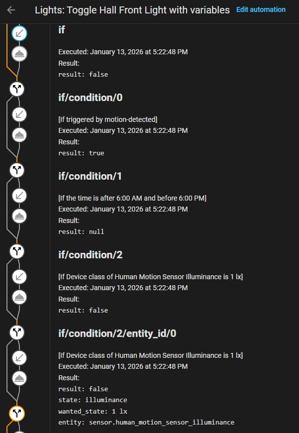 I’m a newbie to HA. I created an automation that turns on a hall light based on a Tuya TS0601 motion sensor. The motion sensor also provides illumination data. I have successfully used the automation to trigger the light at different brightness levels depending on the time of night in addition to motion detection. However, I am trying to add a condition that will combine motion detection during the day when it’s cloudy outside, making the hallway darker during the day than usual. Since the motion sensor has an illuminance sensor, I am creating a condition that checks for that state…less than 50 lx. However, I cannot seem to get the settings correct to get a positive result on the illuminance state. As a simple test, I have played around with different state values to see if I could get any positive results: “< 50”, “<50”, “< 50 lx”, “<50 lx”, “<50lx”, “1”, “1 lx”.
