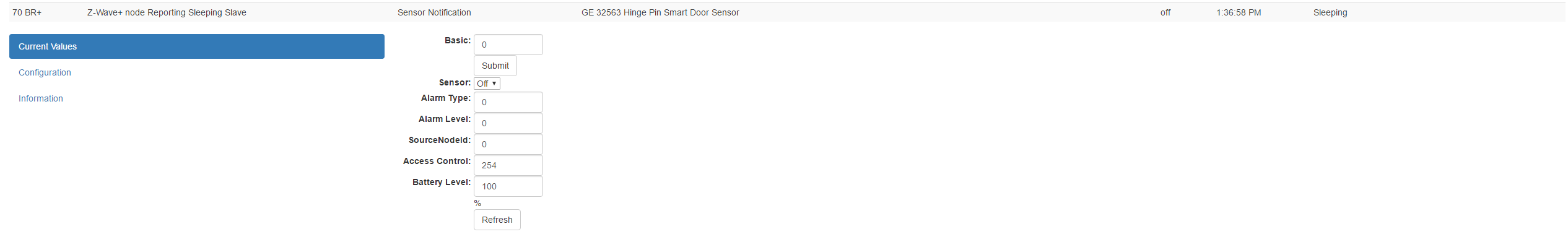 The ‘Back Door’ listed in the group is monitored by an Aeotec Door sensor. Everything below that is the GE sensor. As you can see, it shows a status of on and an access control of 23. I am not sure what the access control is supposed to mean, but it does change with the open and close of the sensor.