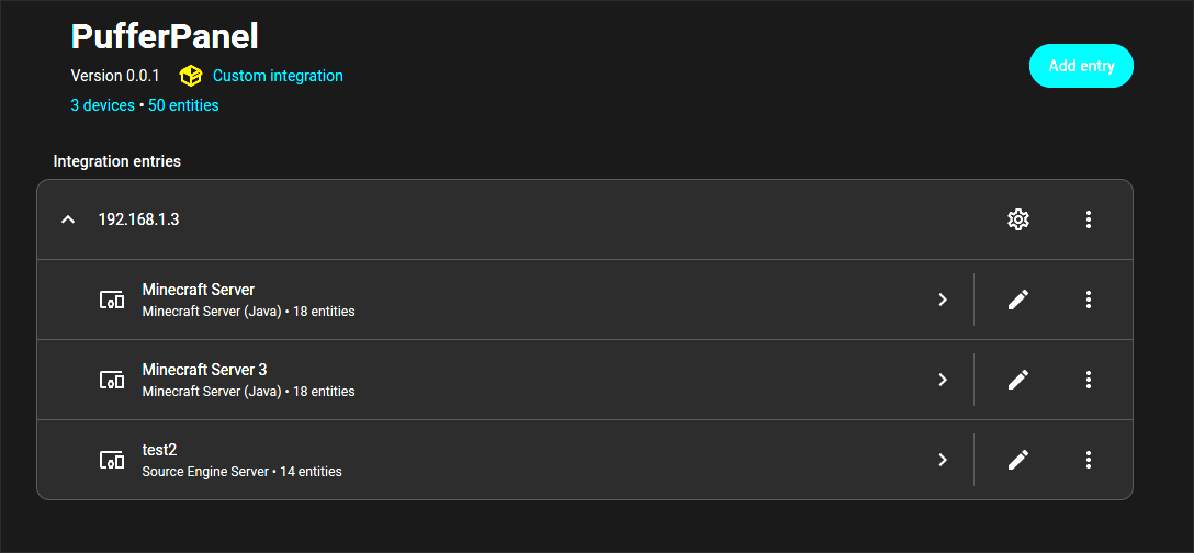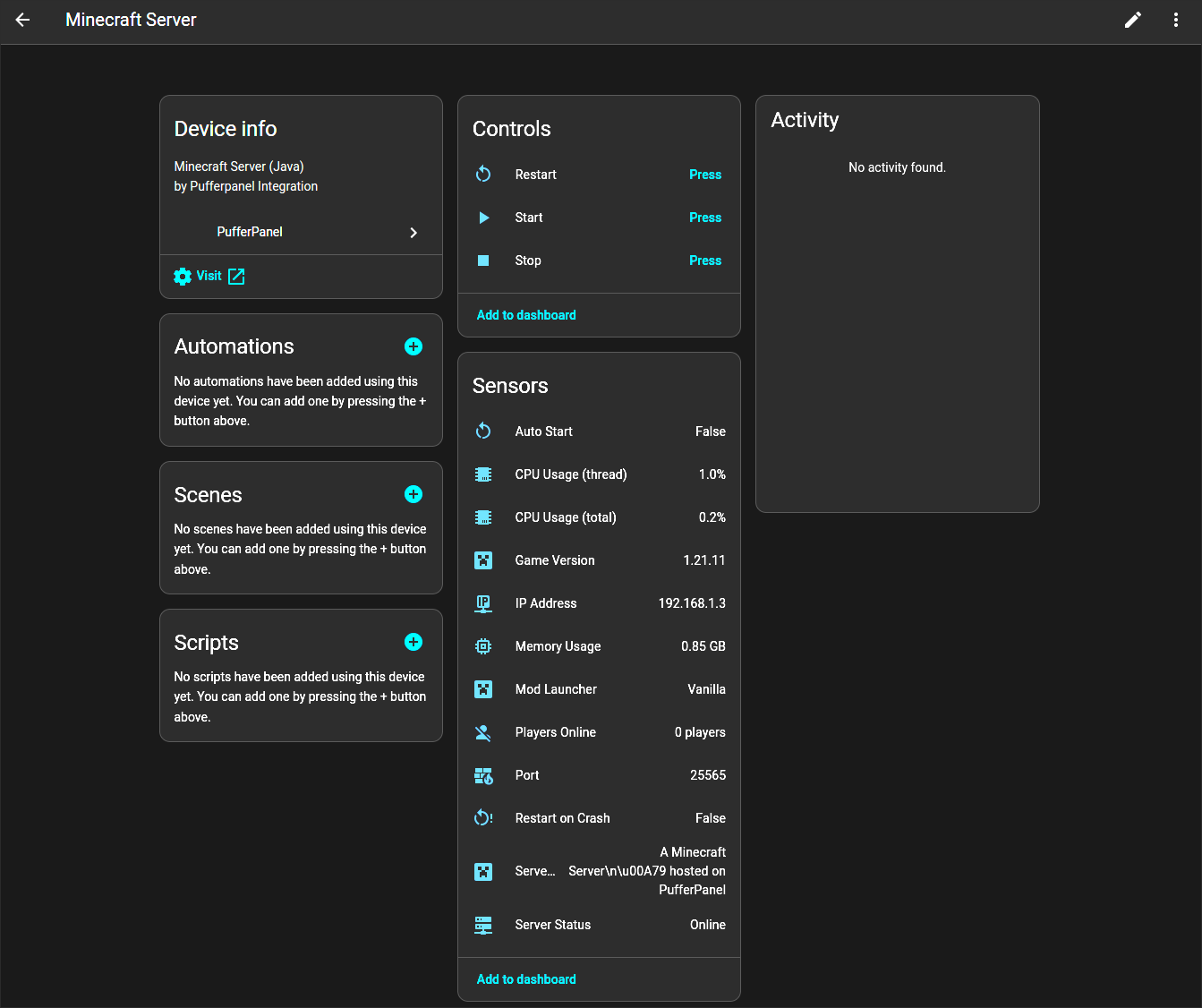 The integration automatically creates a device for each game server created and removes them when the server is deleted. Gives you status, CPU and Memory usage, start, stop and restart commands, IP and port, and for Minecraft servers it also gives player count and MOTD.