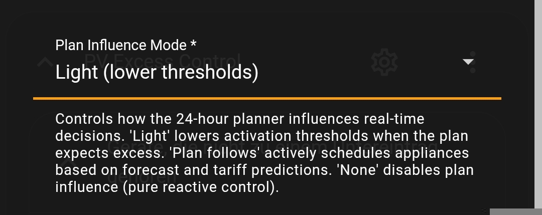 PV Excess Control is a comprehensive Home Assistant integration for intelligent solar excess power optimization and cheap grid tariff management. It looks at your live PV / battery / grid sensors, your solar forecast and your electricity tariff, and decides - every 30 seconds - which of your appliances should be on, off, or running at what current.