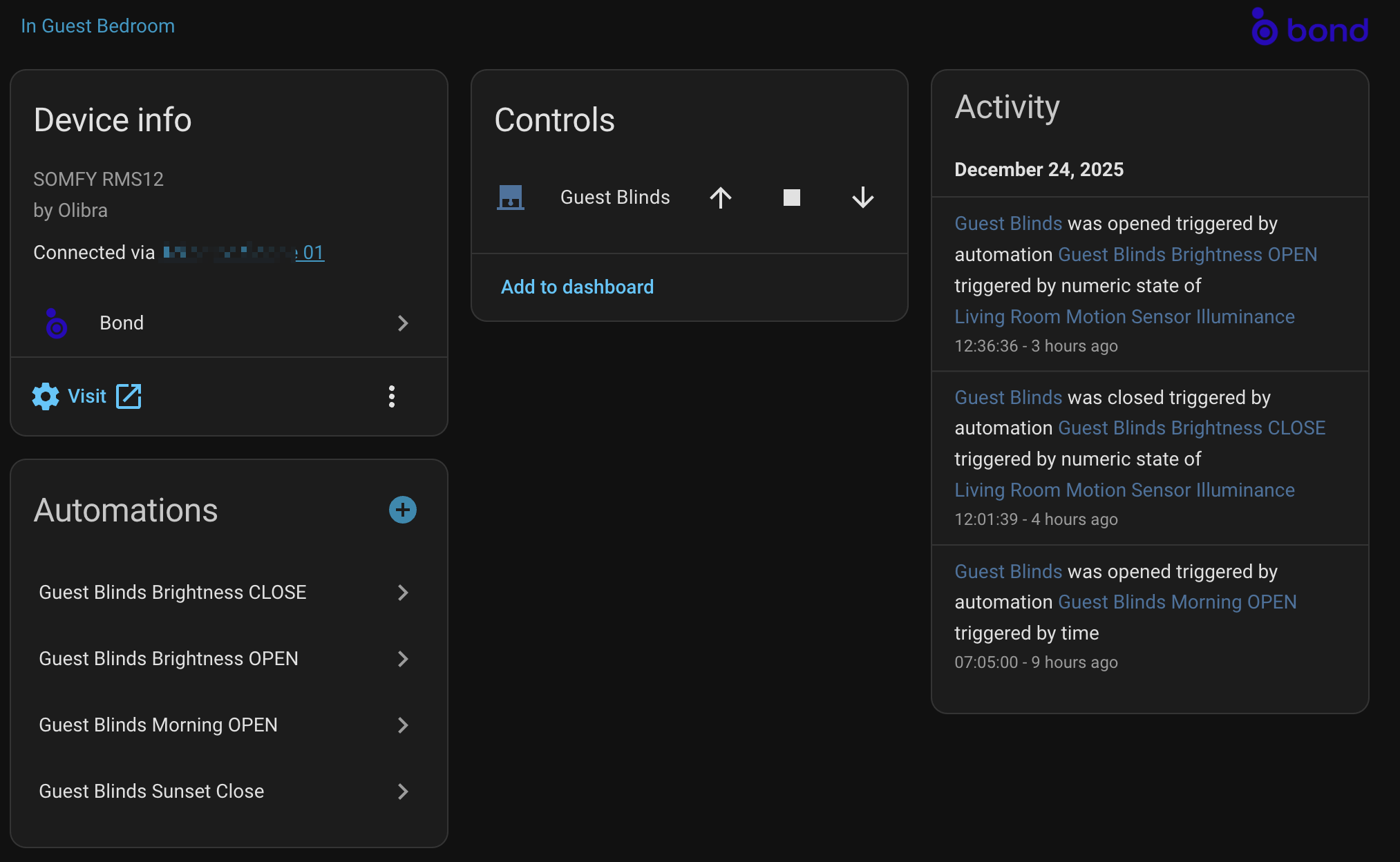The BondI integration has been rock solid for years and has enabled me to control my Somfy blinds seamlessly. I have the wireless Bond Bridge and am having an odd problem with one blind (two motors on the same channel - as I understand it). These motors were installed recently.