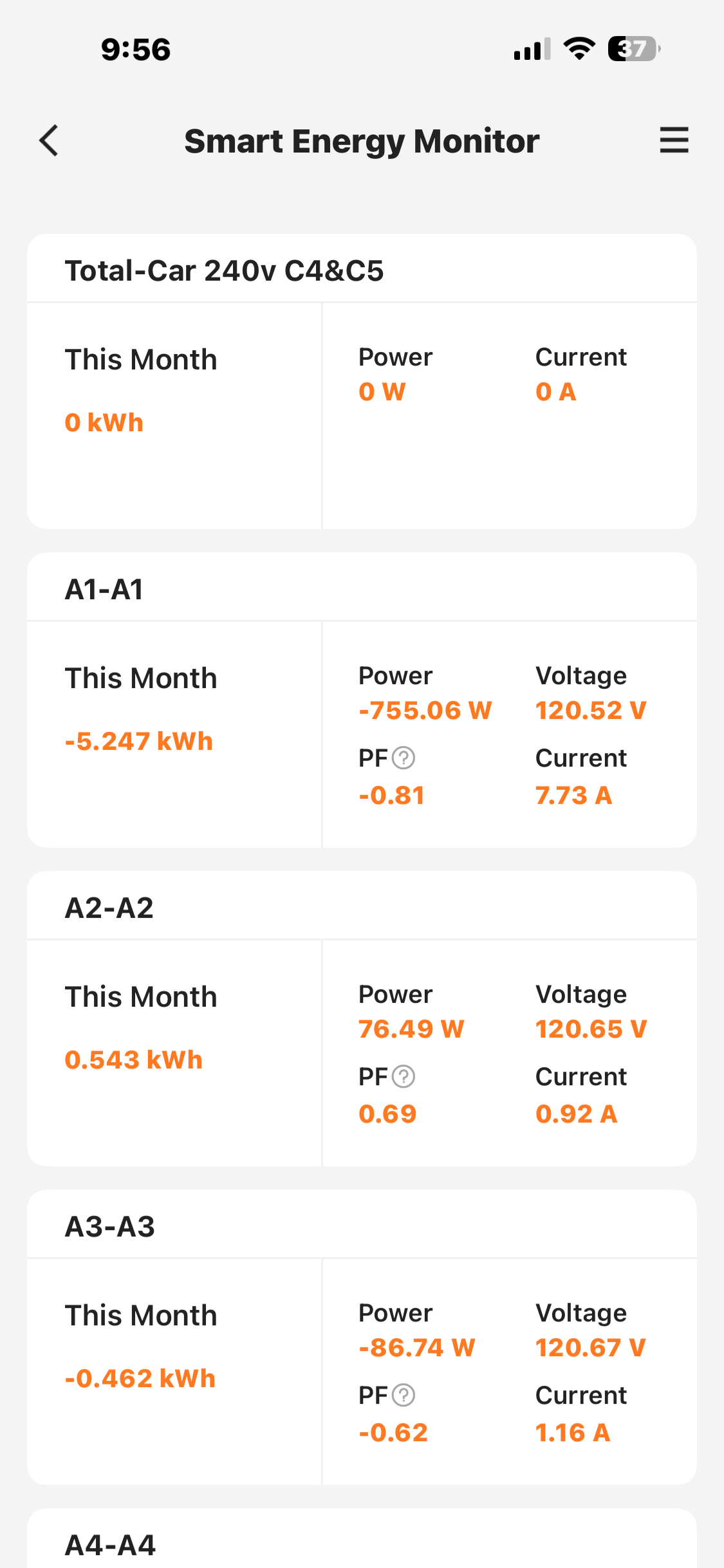 Can someone help me understand the readings? Some are showing a -sign before the number and others are not. I have ensured that all the 60a CTs are pointing away from the breakers and the 200a towards the breaker.