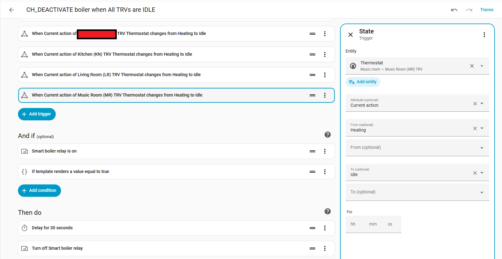 If I manually trigger the action, the boiler relay clicks in and everything starts to heat, but if I save it and leave it …well…I currently have 4 TRVs calling for heat and the boiler relay is off . I manually “kickstart” the boiler relay - the house gets up to temperature and the Boiler_OFF automation shuts it down when the last TRV transitions to “Idle”